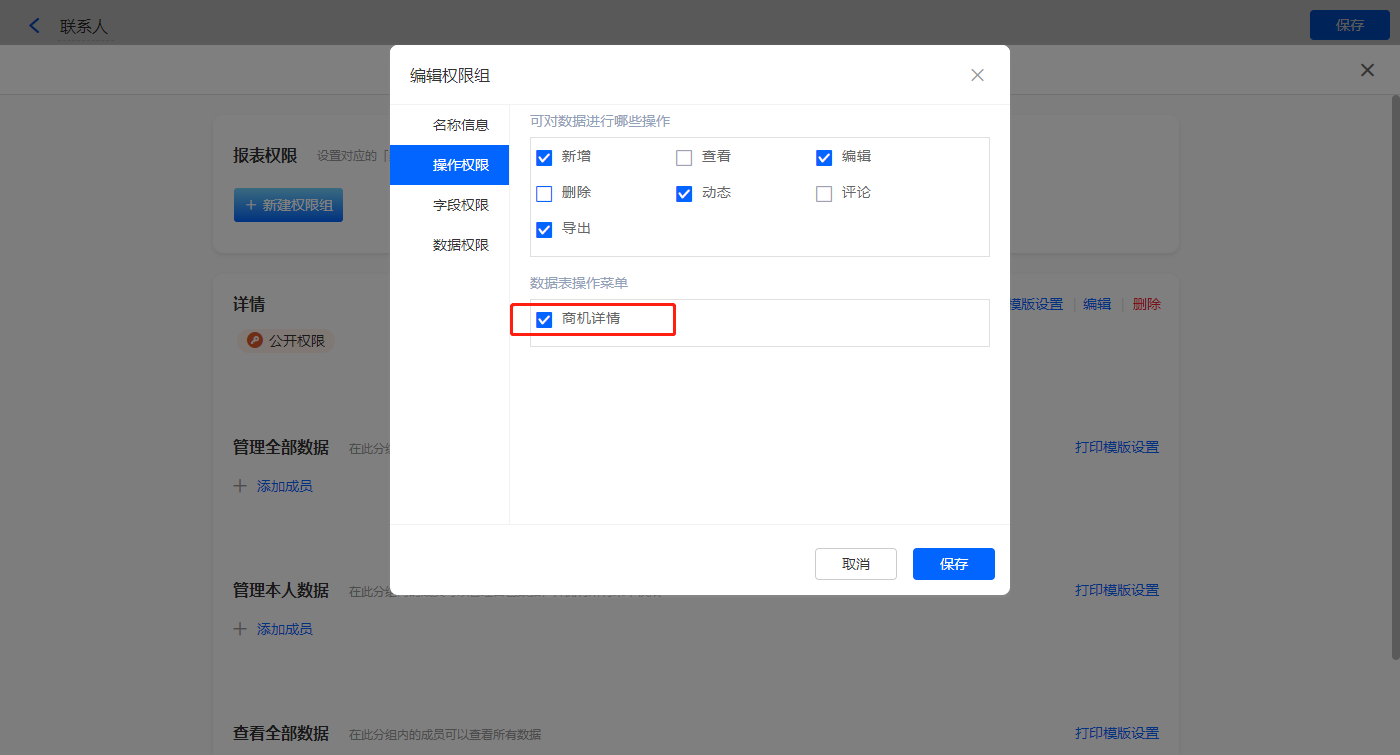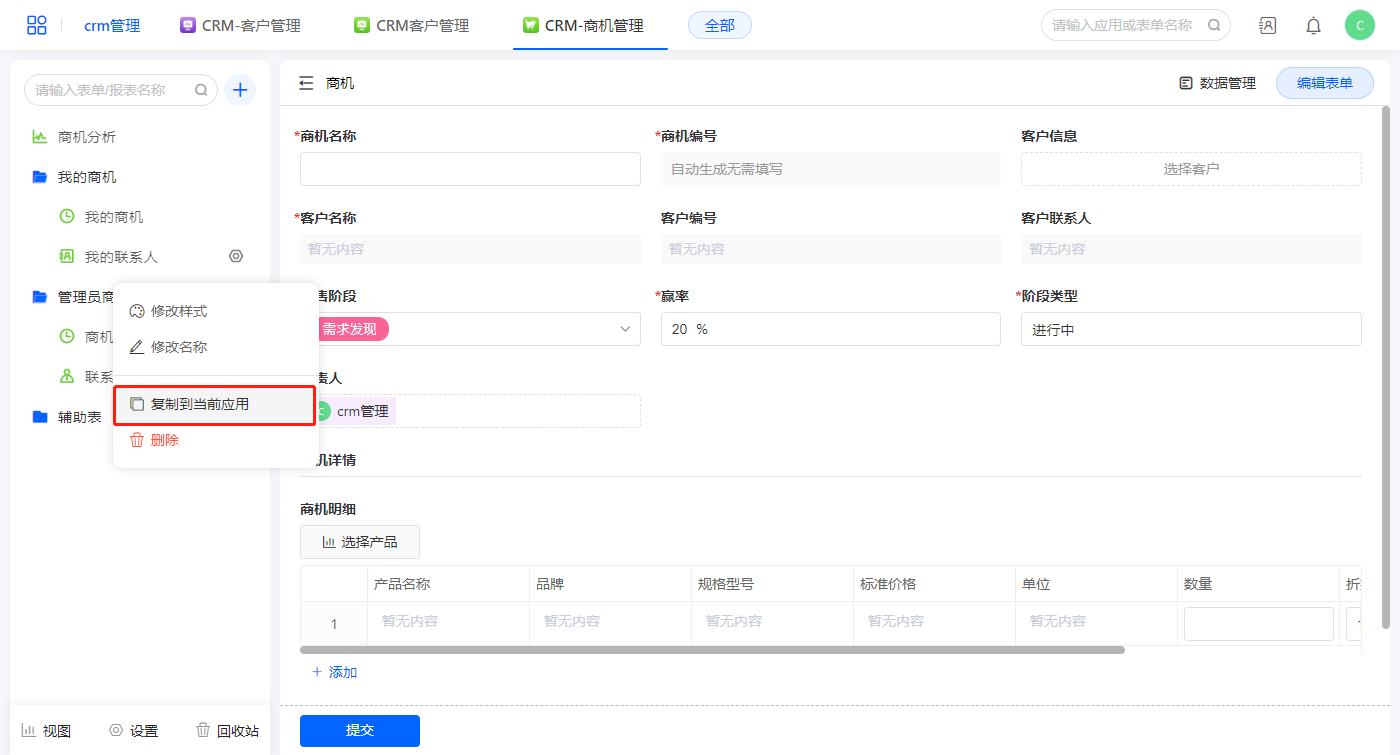 【商机详情】的菜单栏,操作模式设置为弹出报表【商机】,设置表单传递值,点击【确认】;