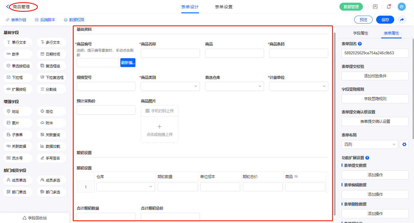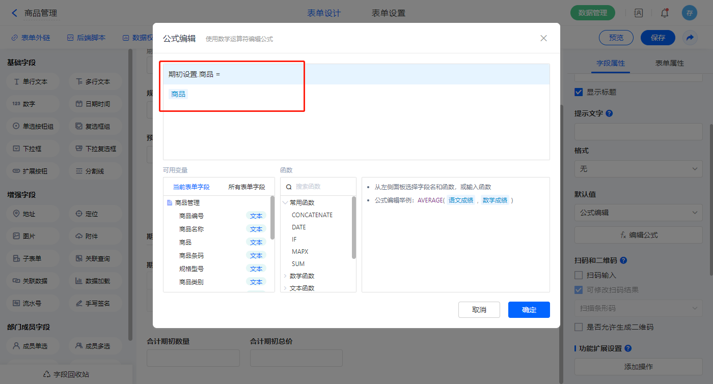 【期初设置.商品】字段设置默认值为公式编辑,如图设置公式;同时该字段设置为不可见;