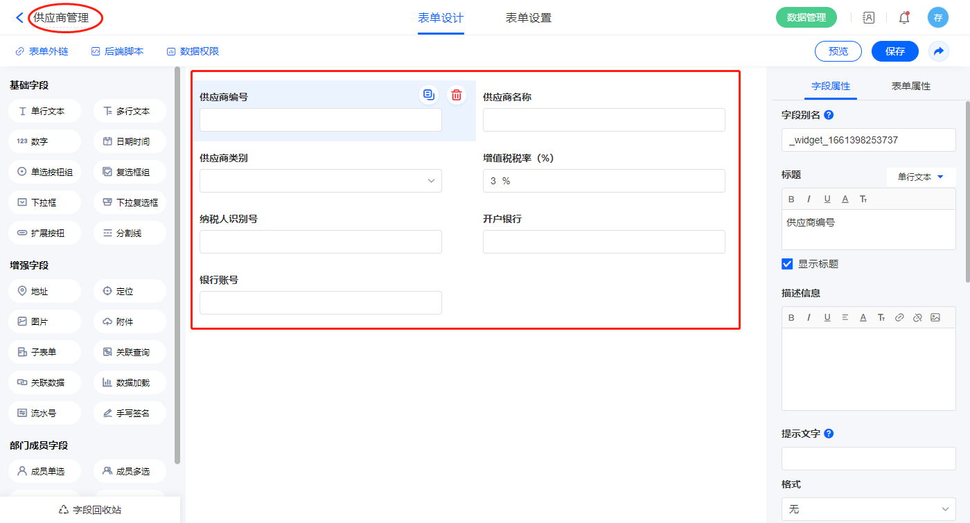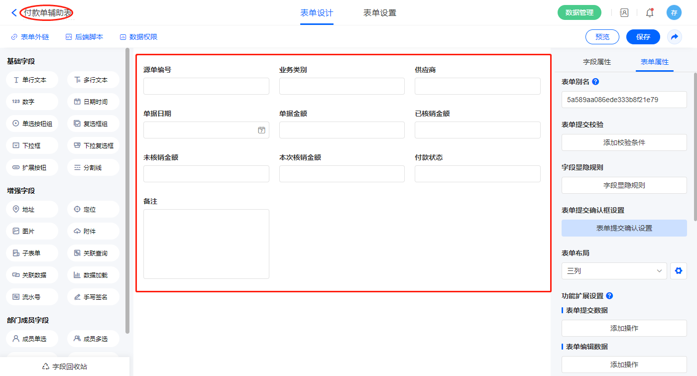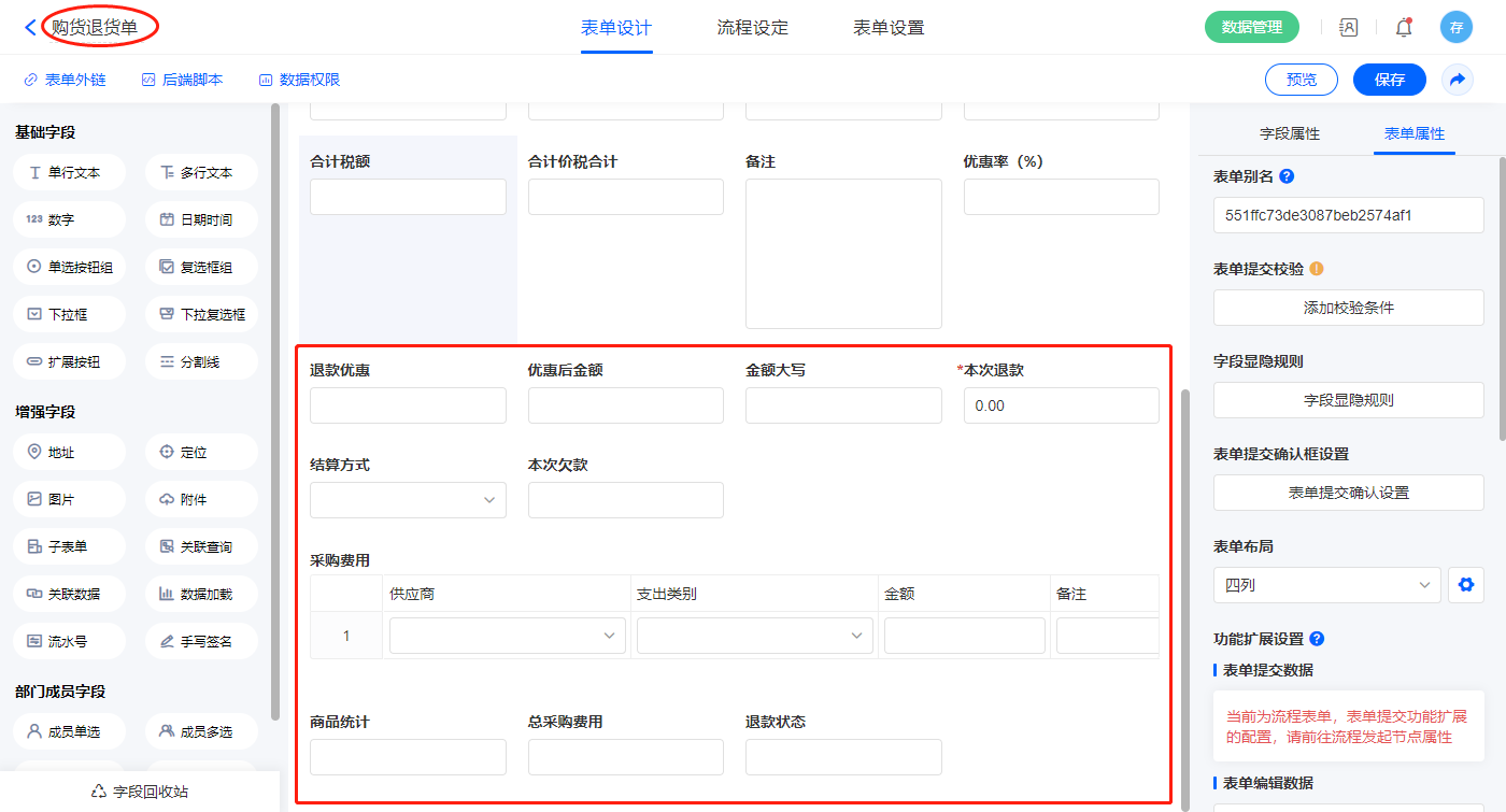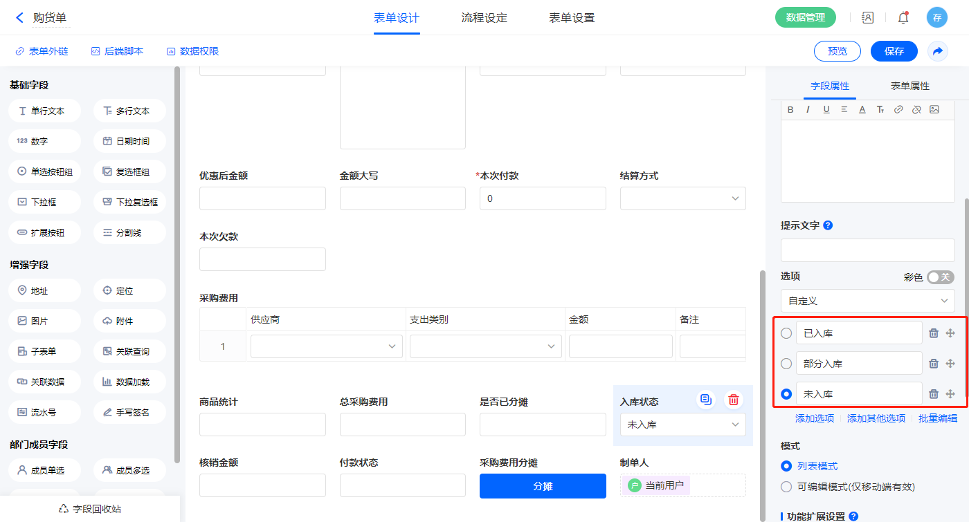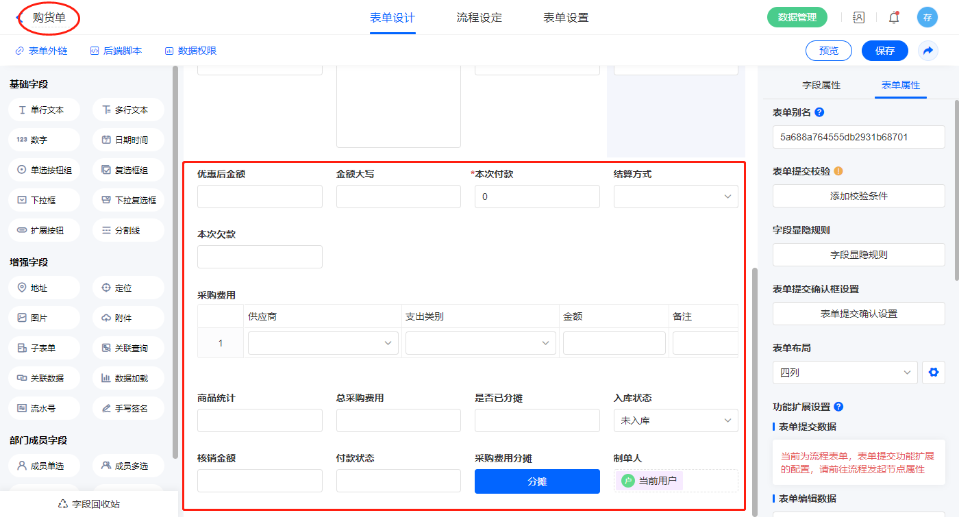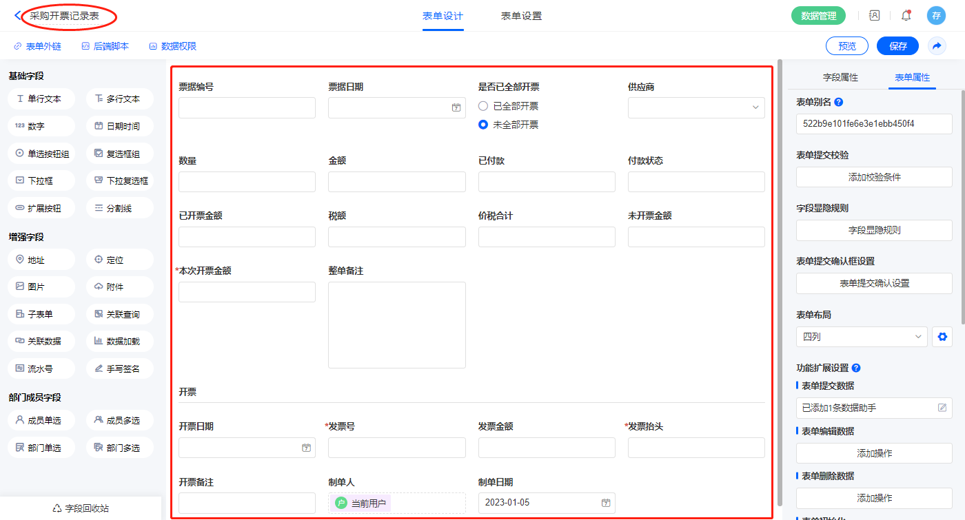 2.10、表单【采购开票记录表】字段及表单属性设置