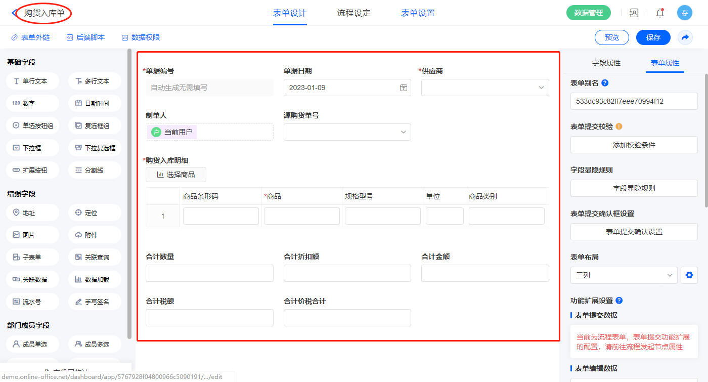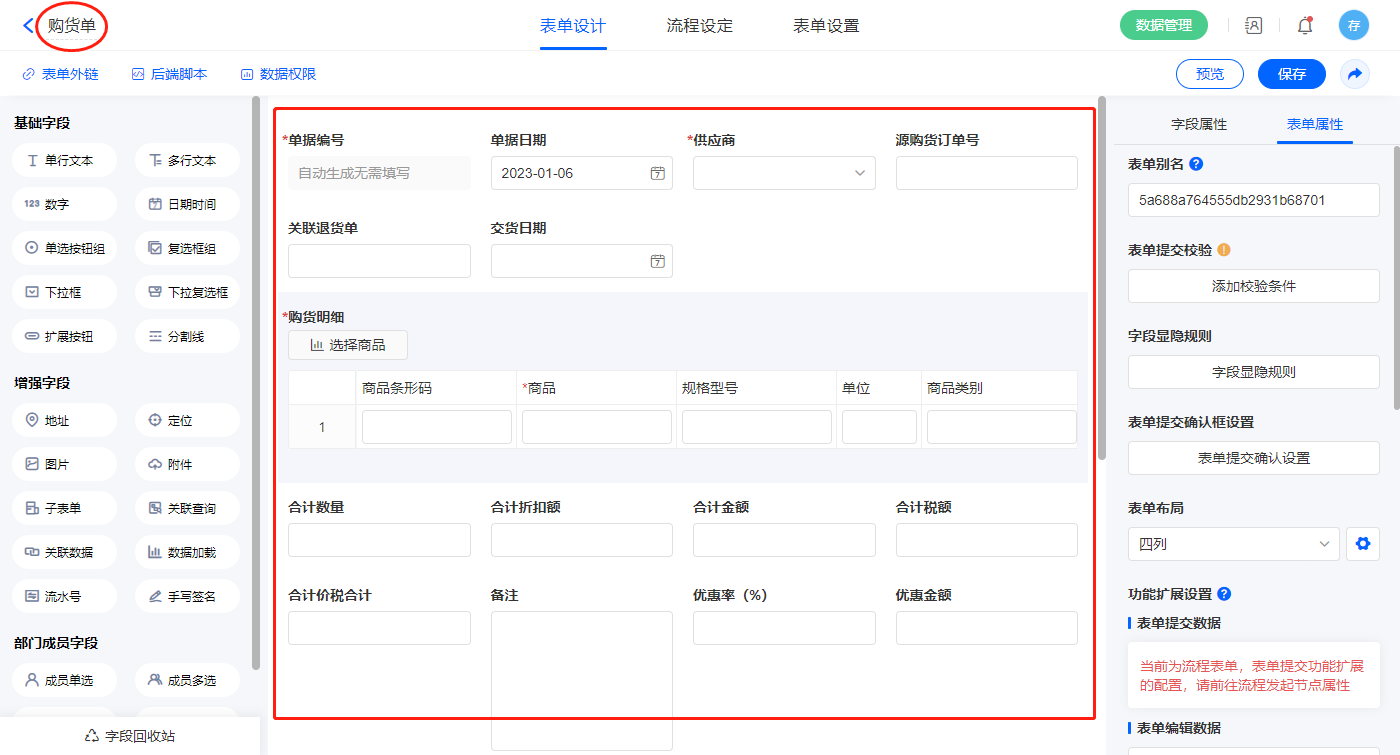 3)该表单是流程表单,设置流程节点审核,该节点属性的节点权限提交设置一条数据助手,名称为修改购货单状态;
