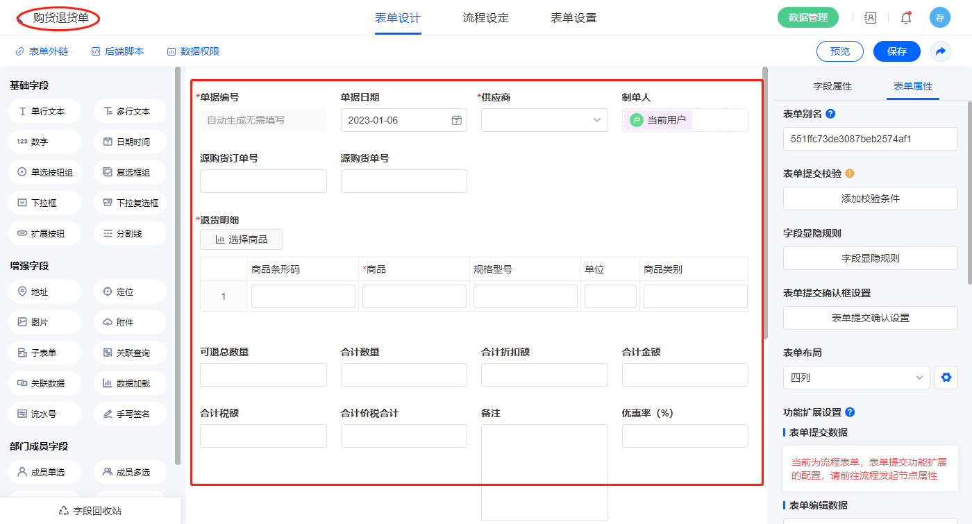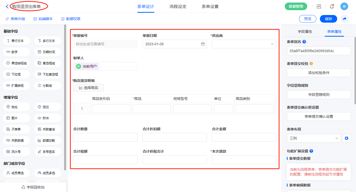 2.6、表单【购货退货出库单】字段及表单属性设置