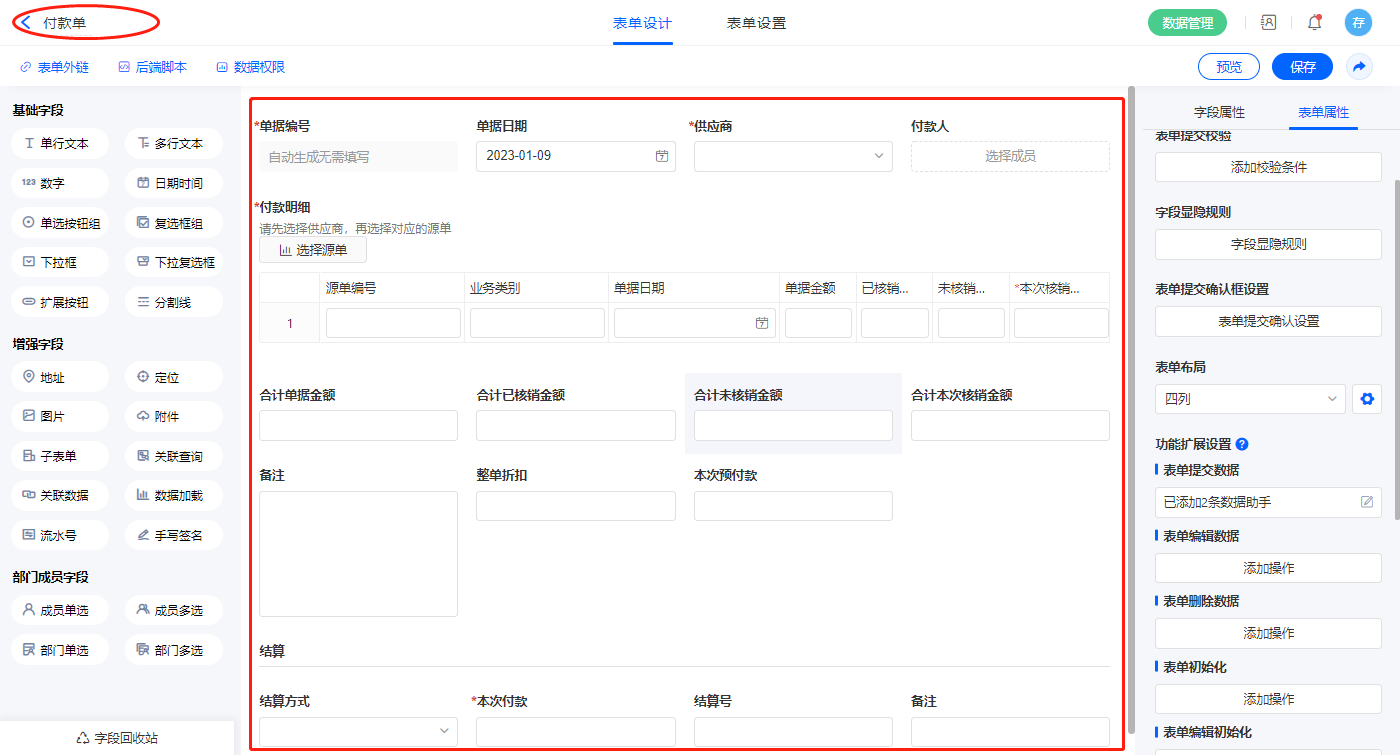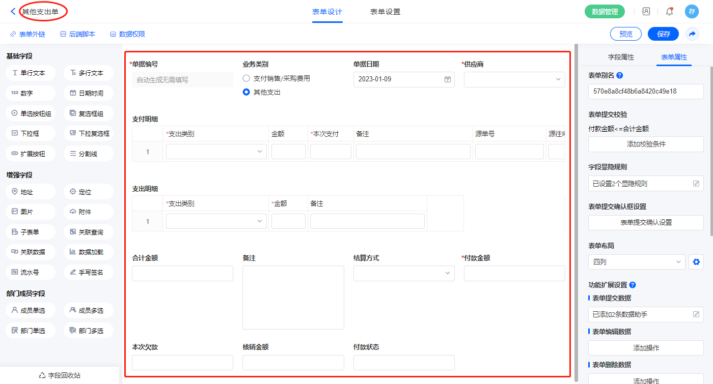 【付款金额】字段设置默认值为公式编辑,设置公式:“IF(业务类别=="支付销售/采购费用",SUM(支付明细.本次支付),SUM(支出明细.金额))”;