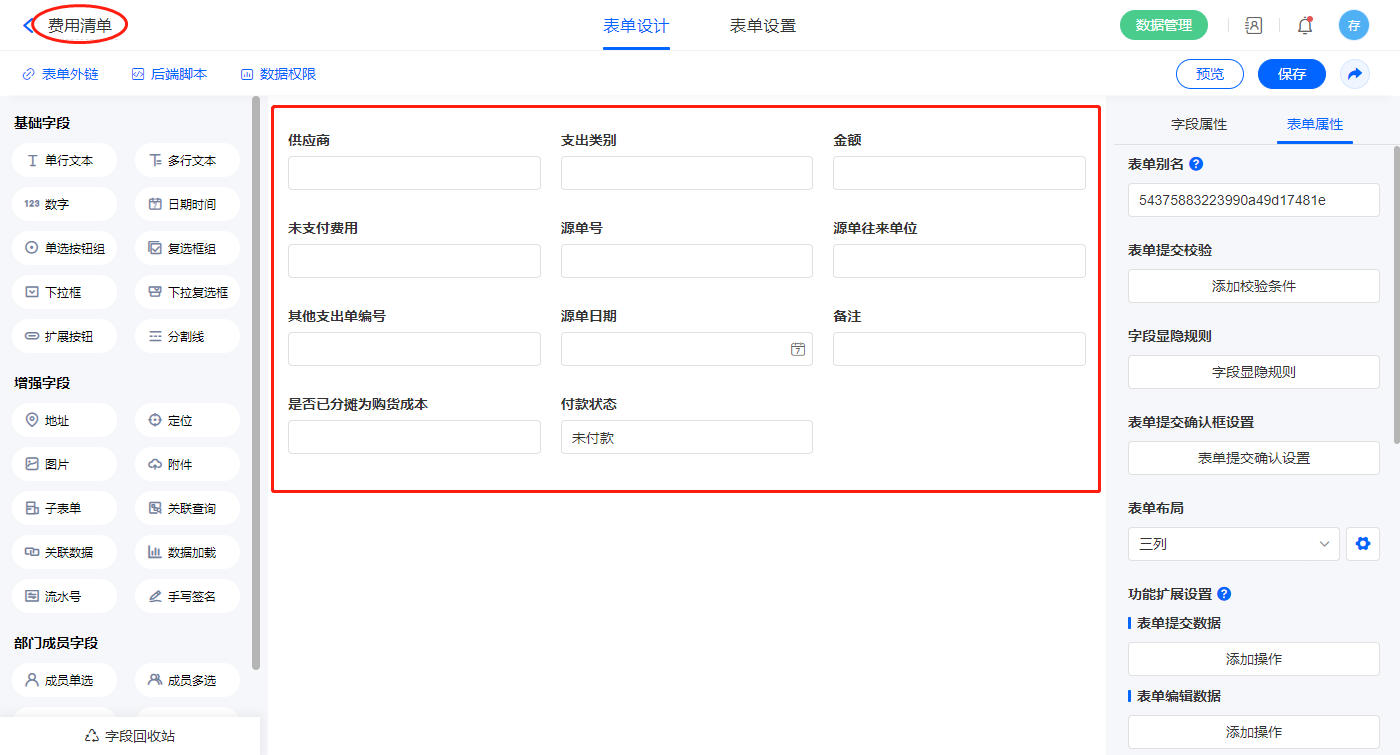 1)新增【费用清单】报表,用基础报表【数据表】展示数据源为表单【费用清单】的数据;