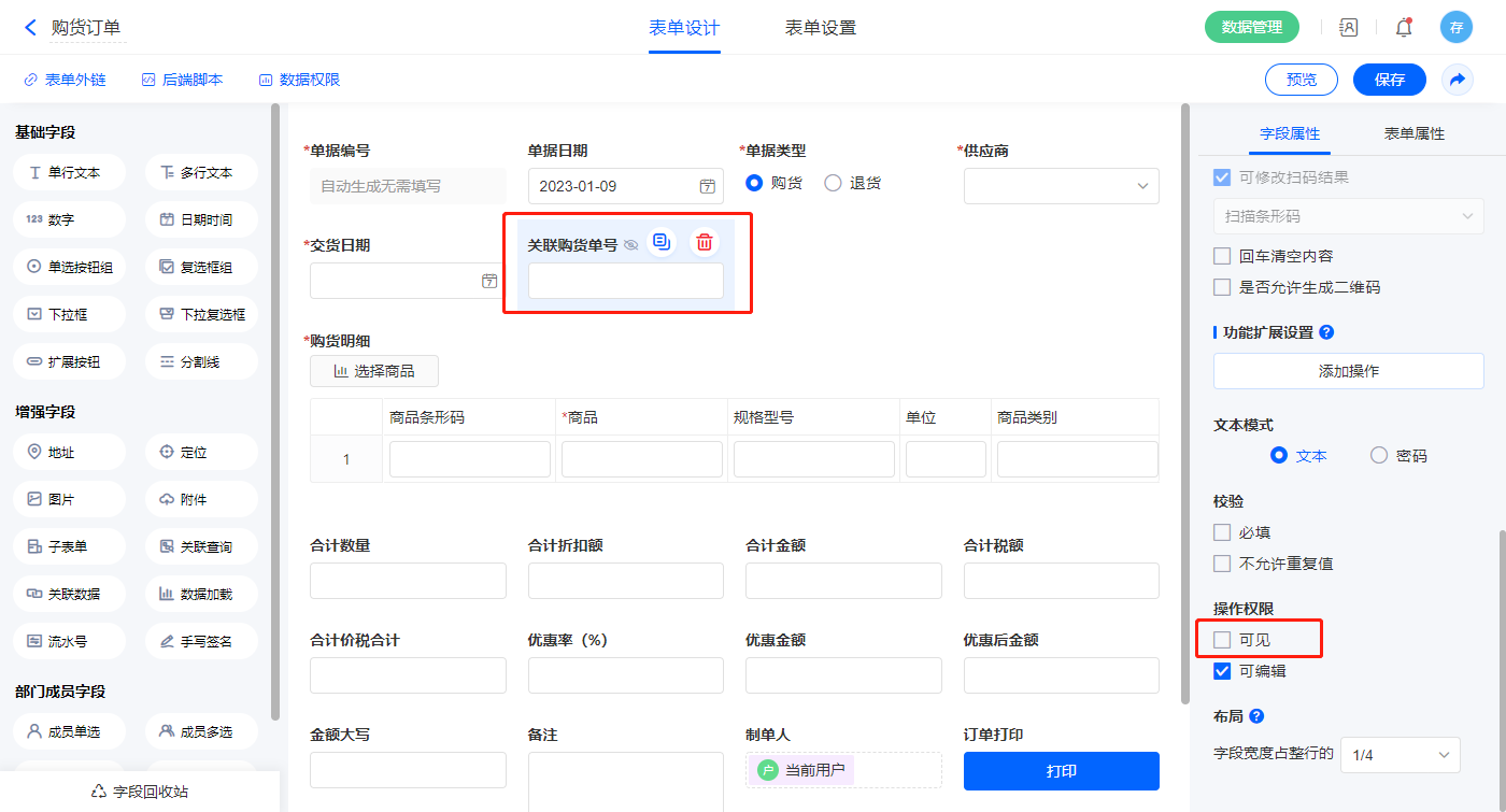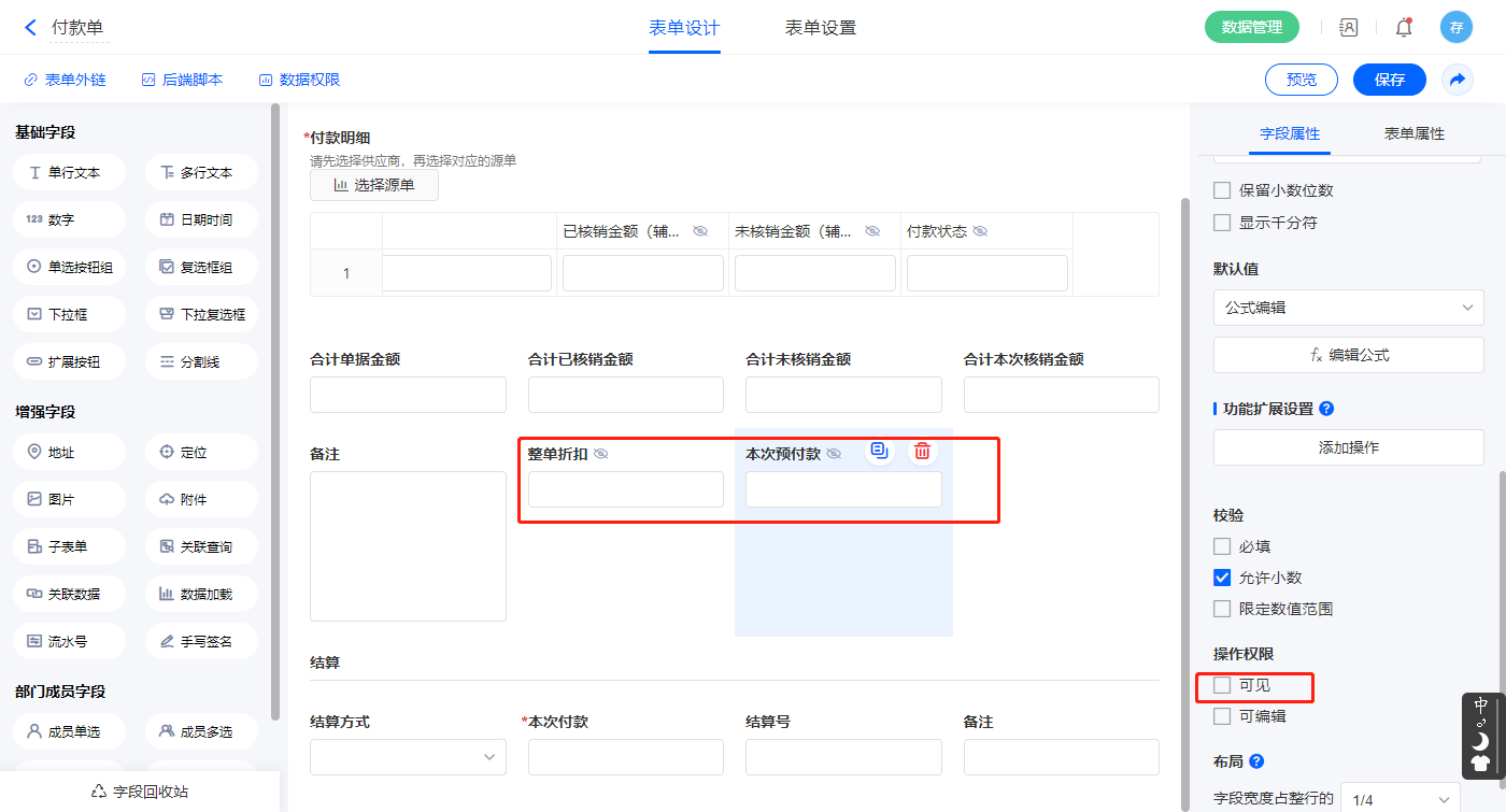 3)【整单折扣】、【本次预付款】两个字段设置不可见;