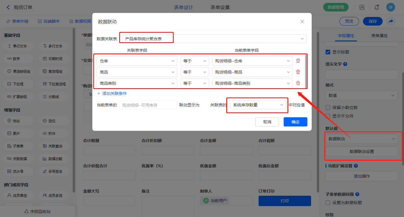 3)【仓库】字段,选择设置为关联其他表单数据,关联仓库管理的【仓库名称】字段;