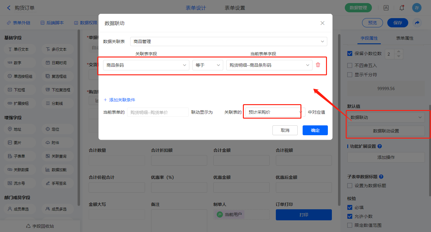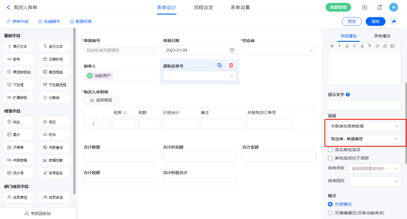 2)选择【源购货单号】字段,设置选项为其他表单数据,关联购货单的【单据编号】字段;