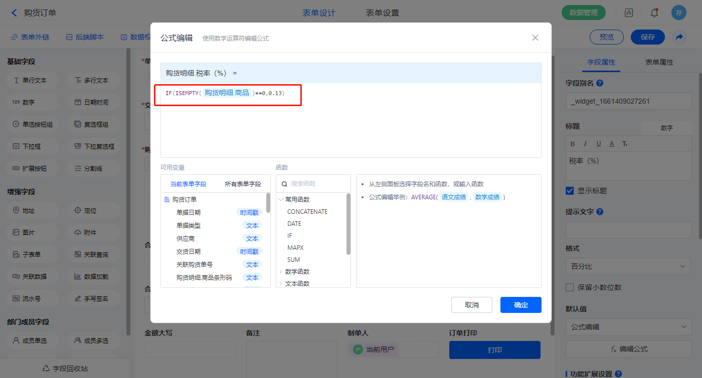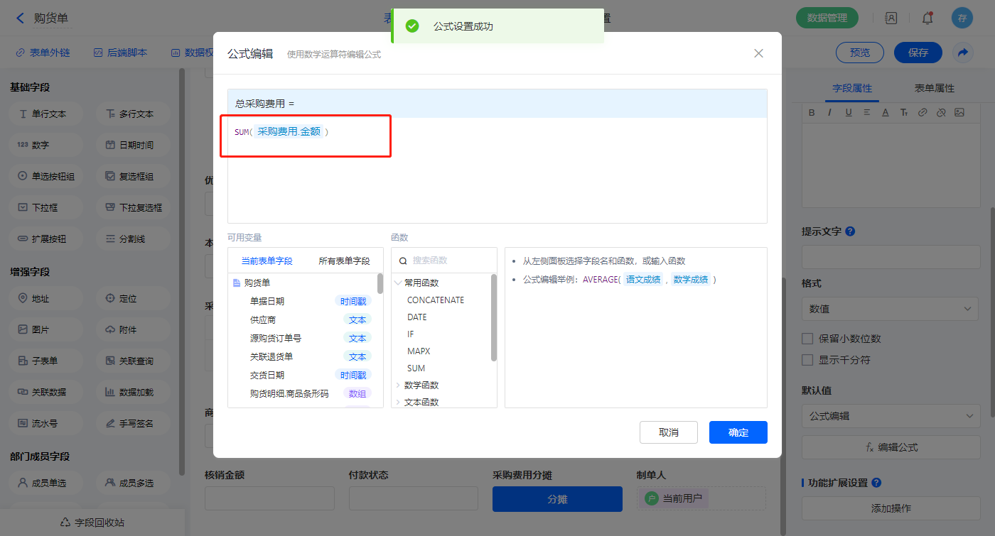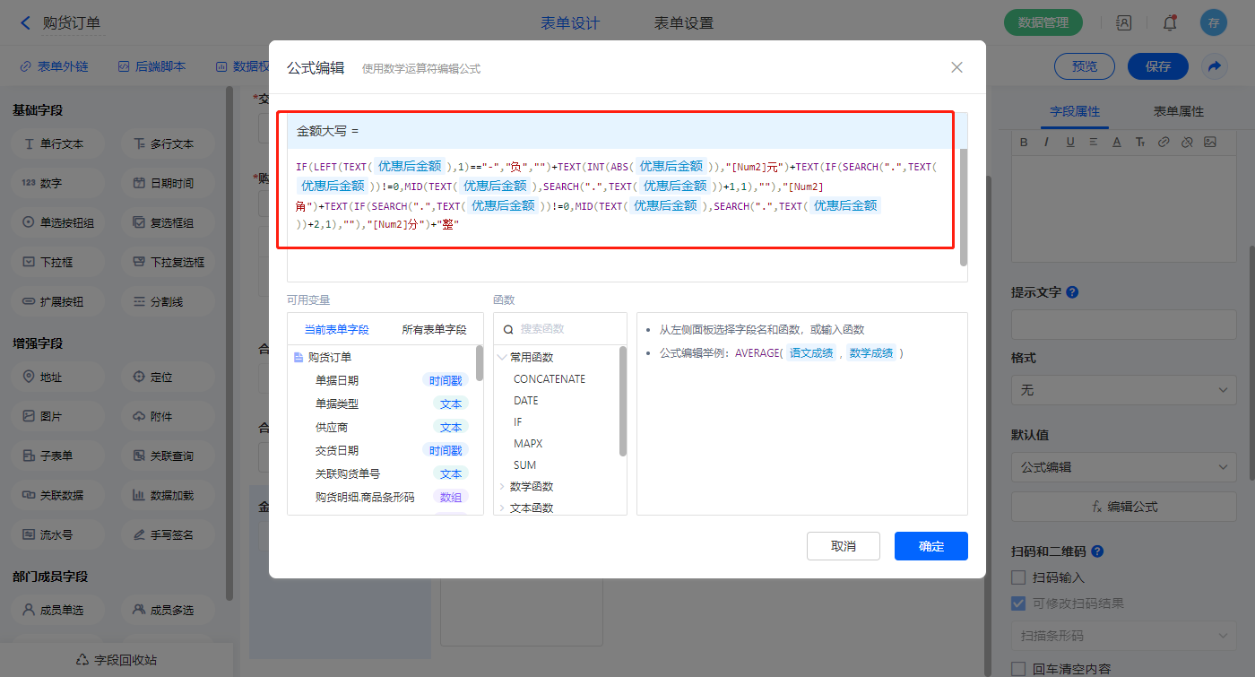【本次欠款】字段设置默认值为公式编辑,如图设置公式;