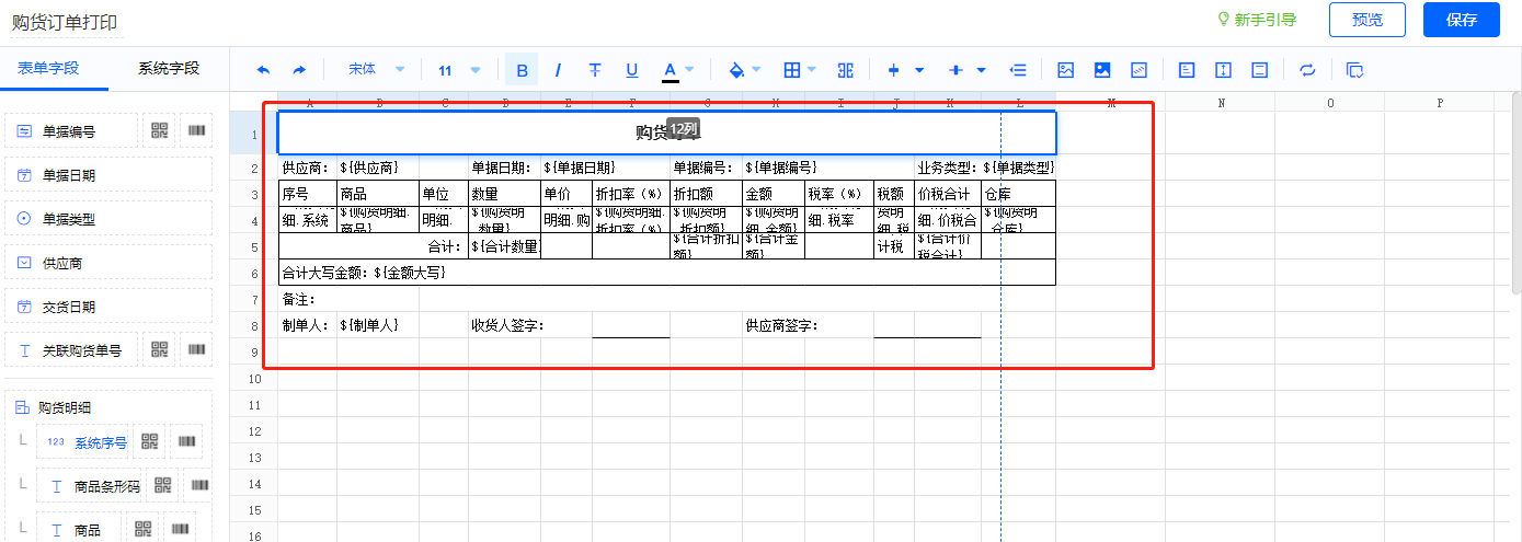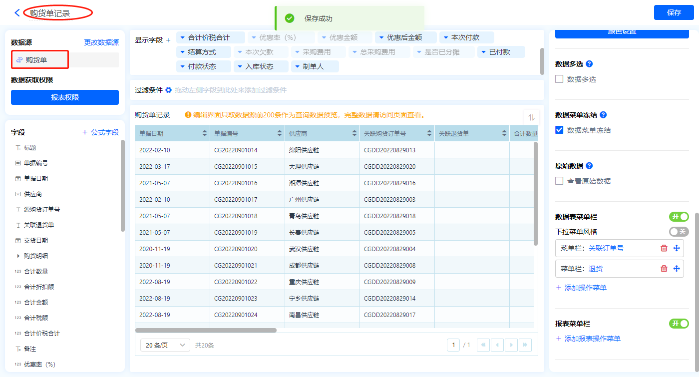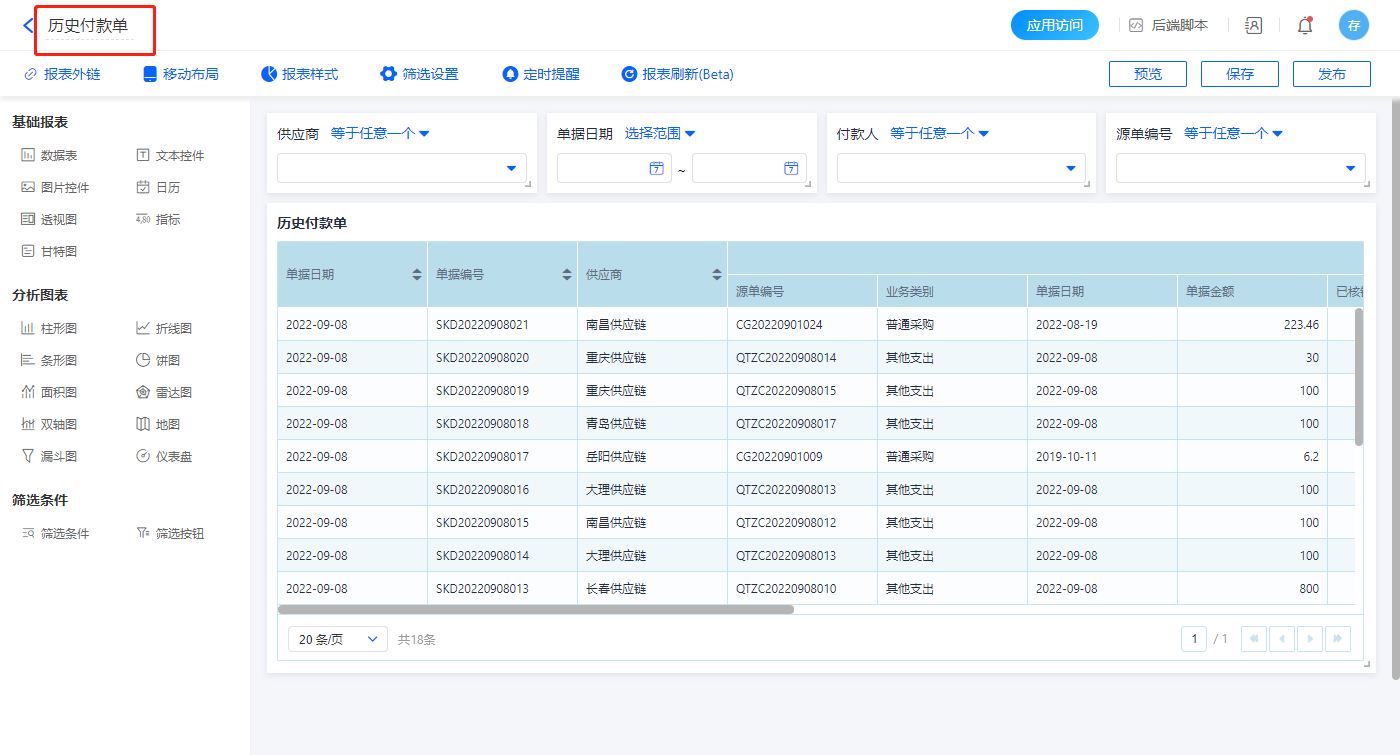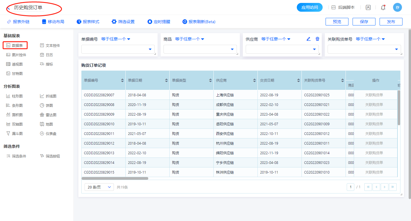 1)新增【历史购货单】报表,用基础报表【数据表】展示数据源为表单【购货单】的数据;