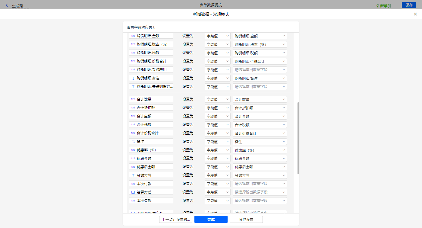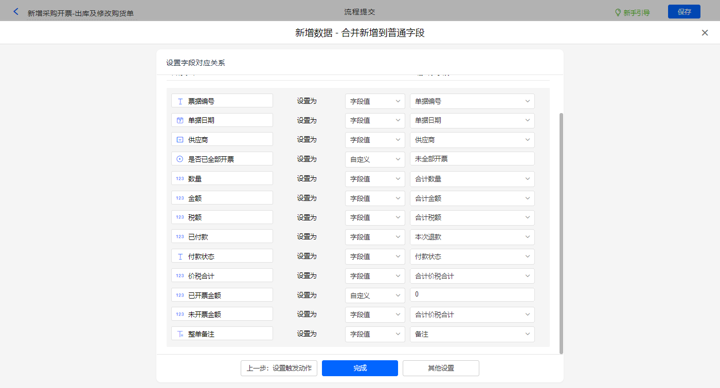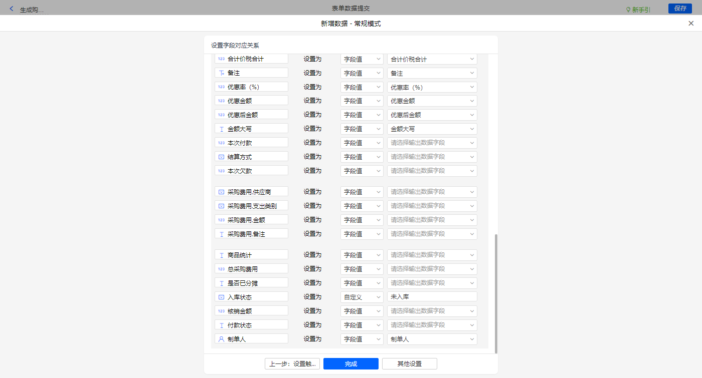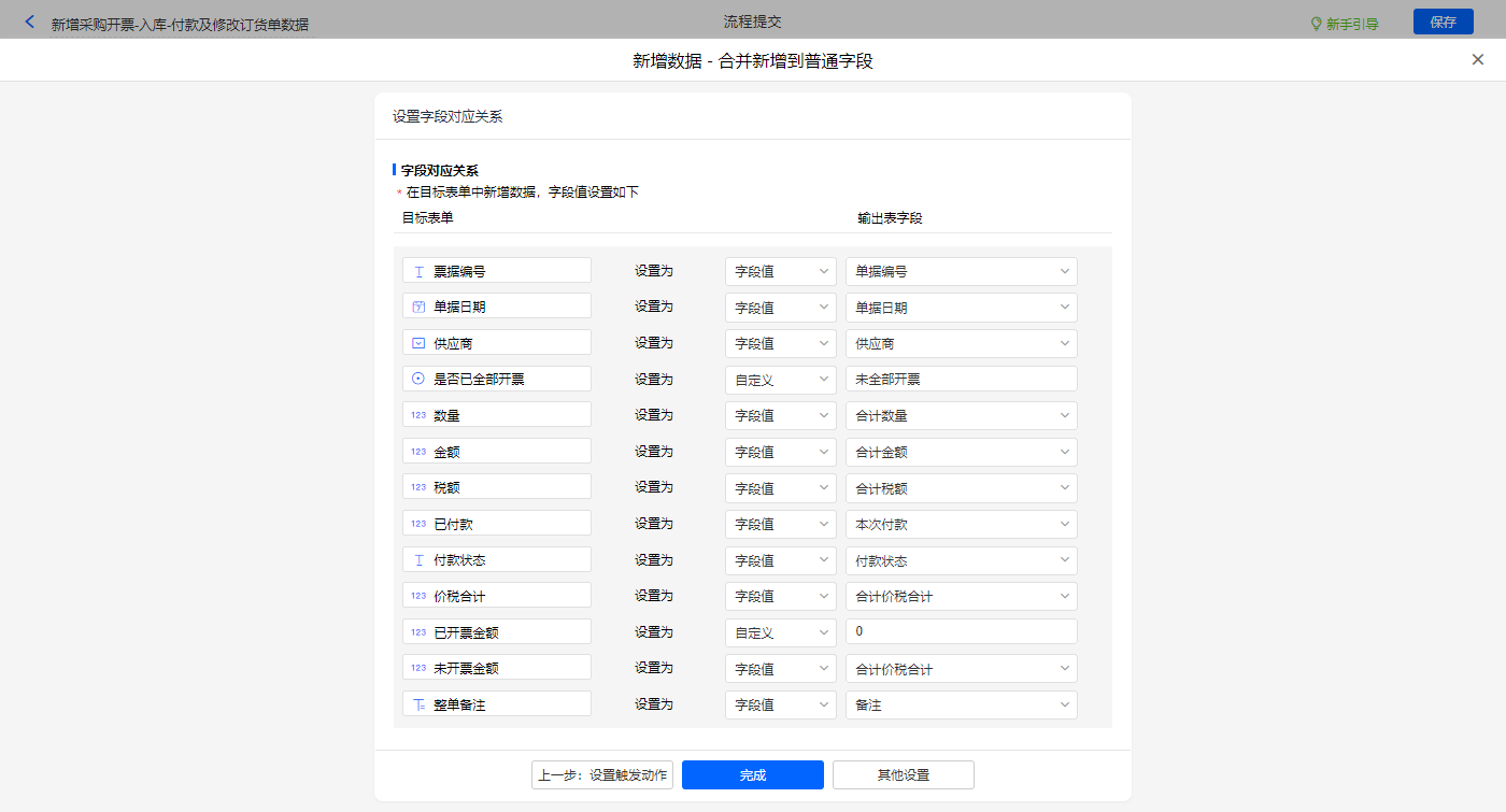 新增采购开票-出库及修改购货单的数据助手,有三个执行动;新增新增数据的执行动作,选择目标表单【采购开票】,选择对应字段,设置好点击【完成】并保存该数据助手;