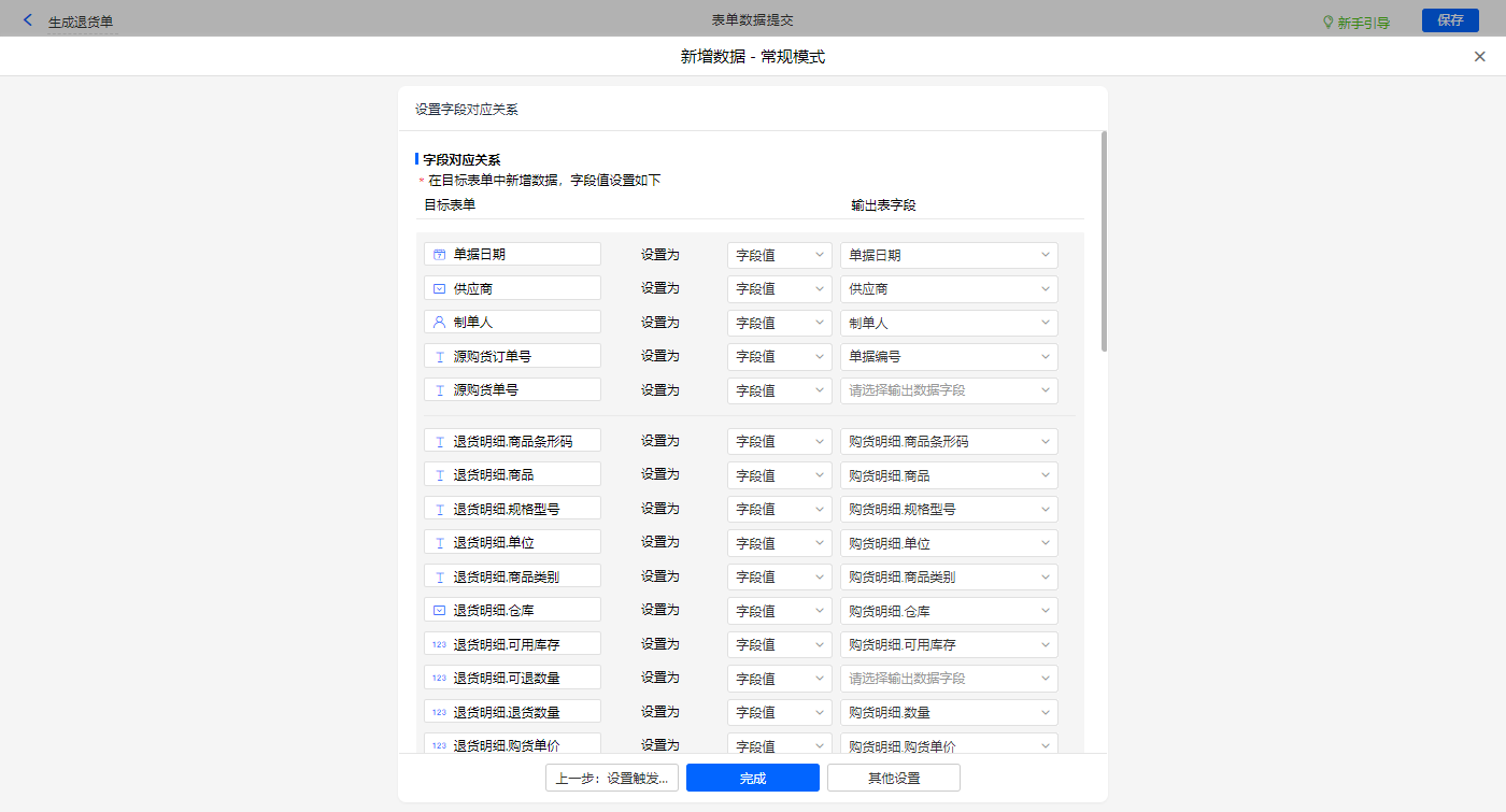 再新增新增数据的执行动作,选择目标表单【退货出库单】,选择对应字段;