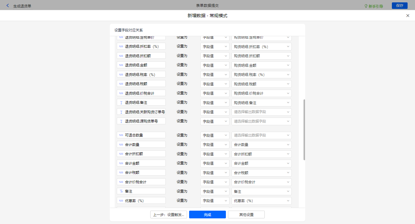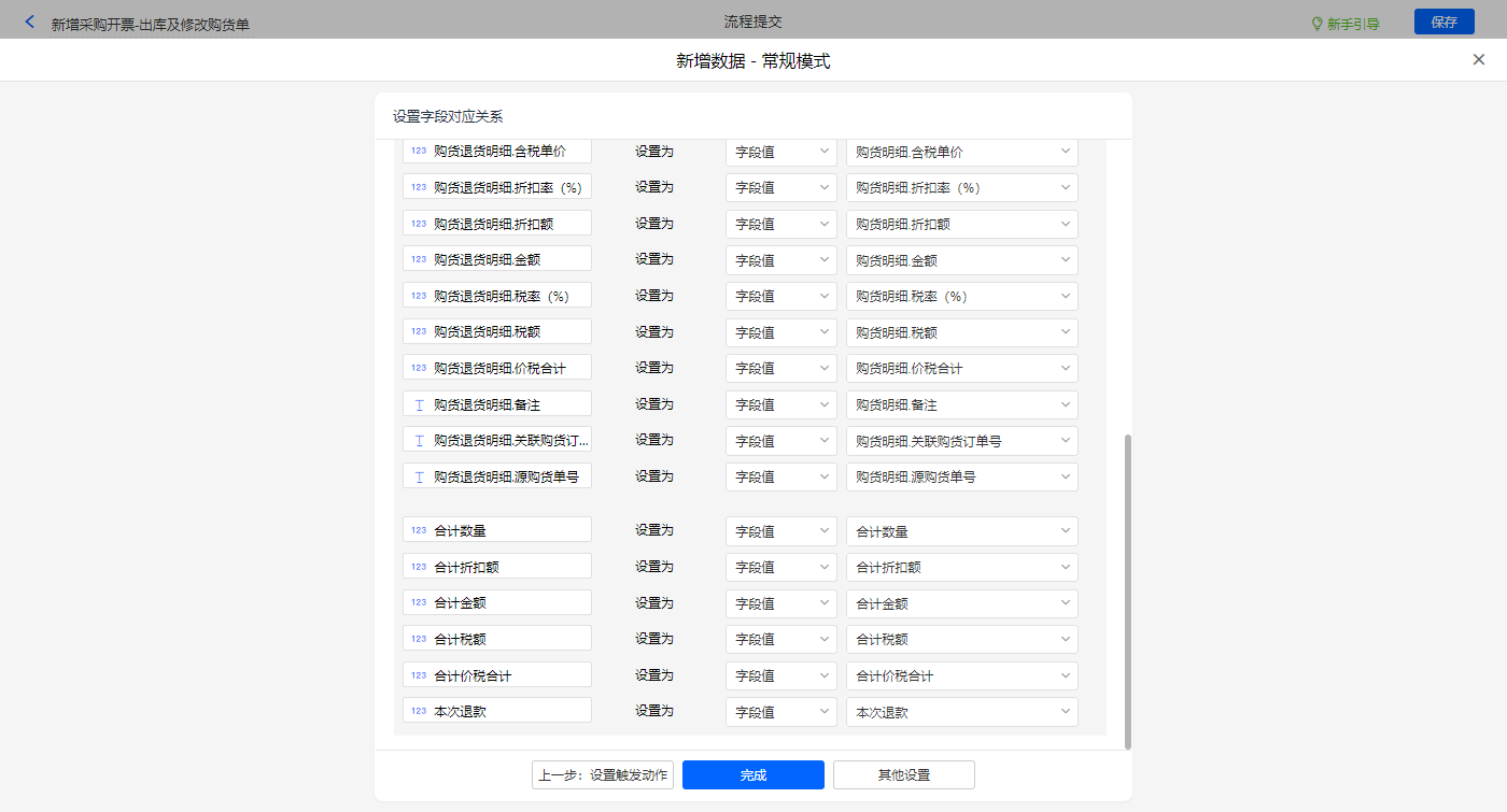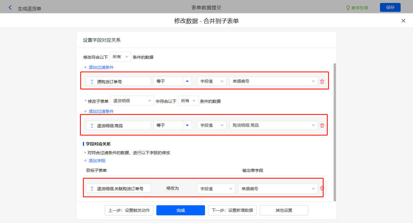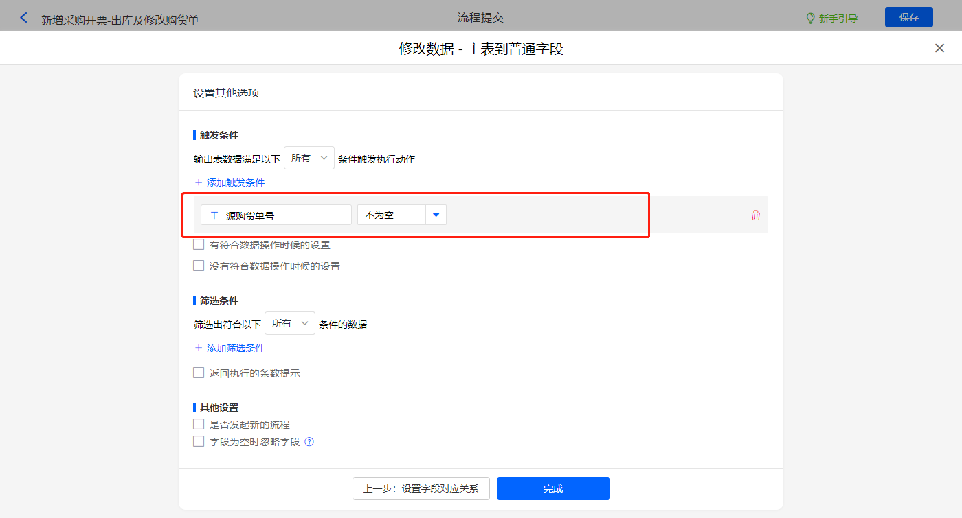 其他设置触发条件为【源购货单号】不为空,设置好点击【完成】并保存该数据助手;