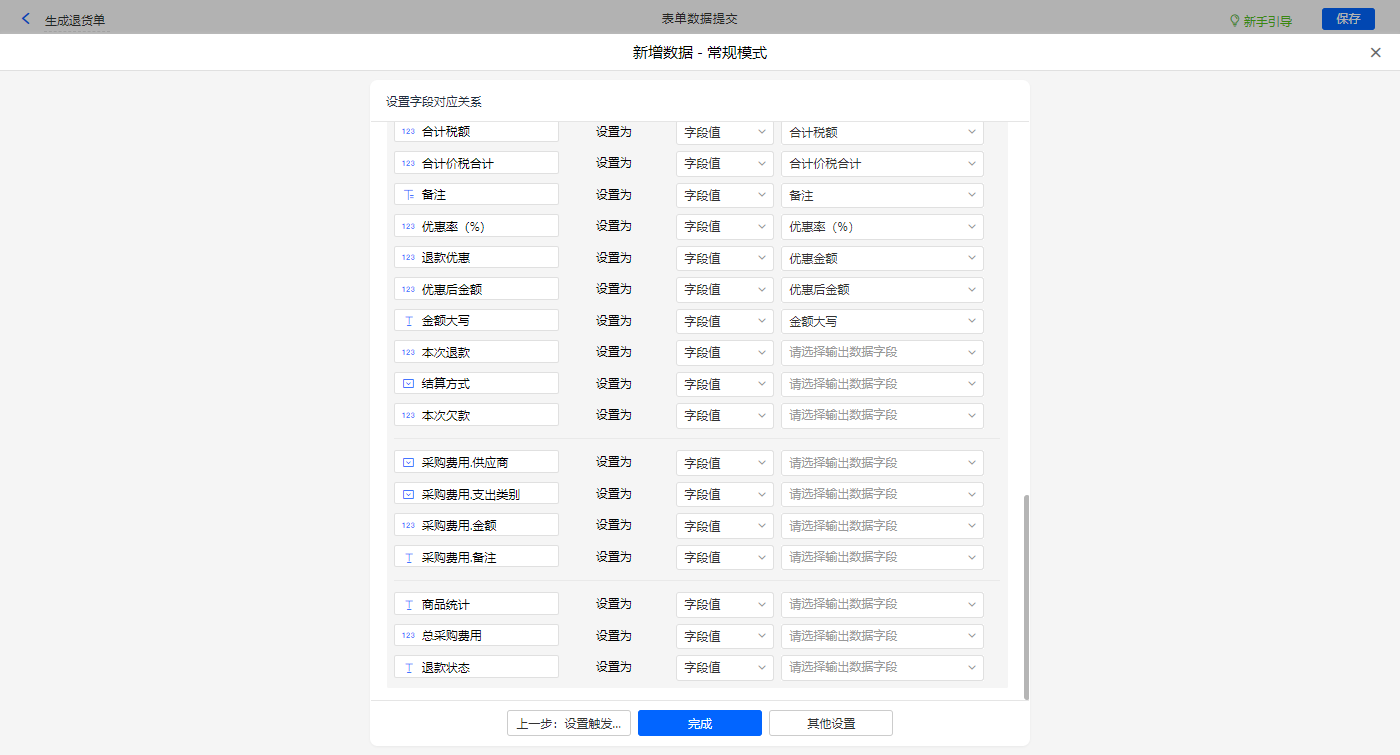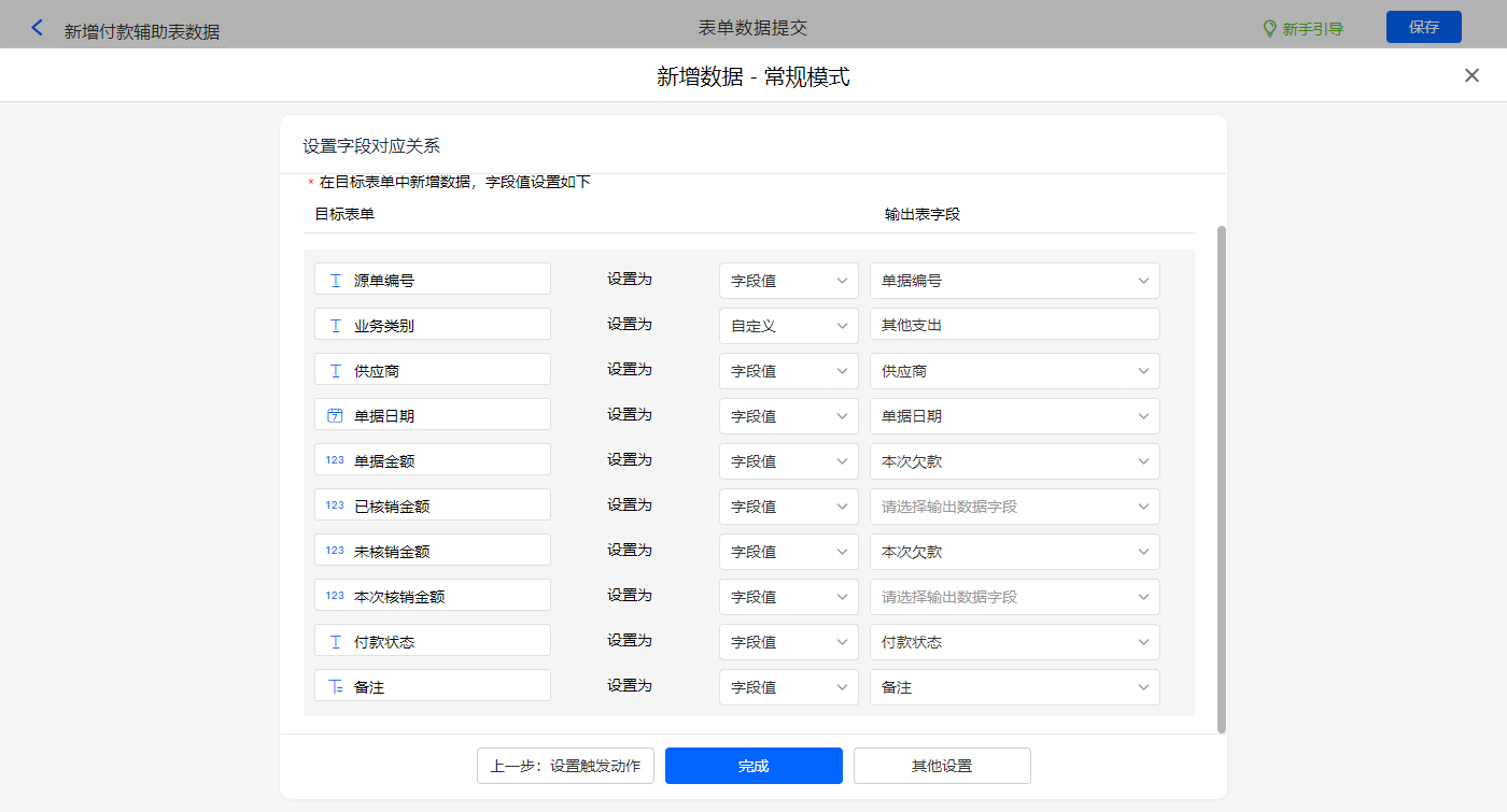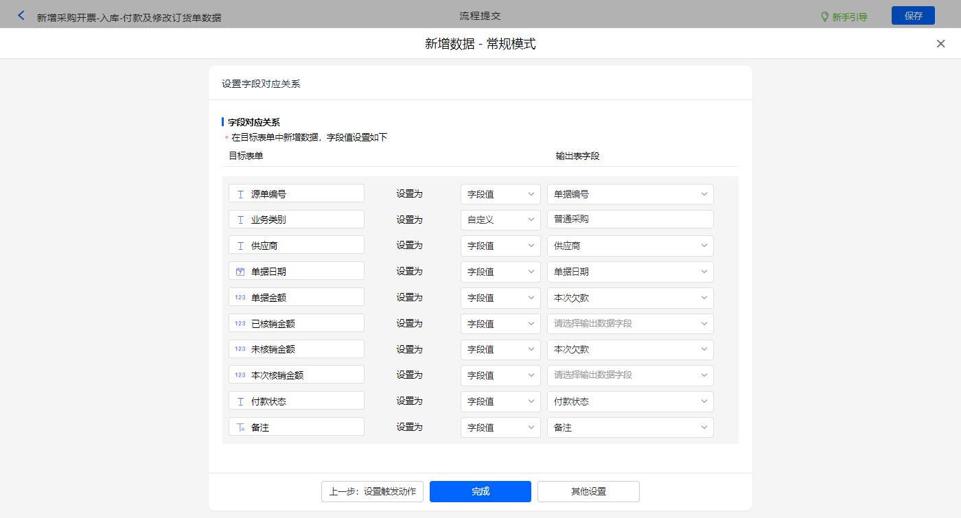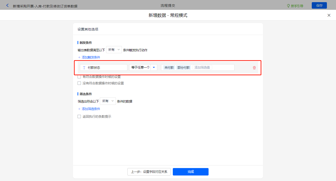 其他设置触发条件为【付款明细.业务类别】等于普通采购,设置好点击【完成】并保存该数据助手;