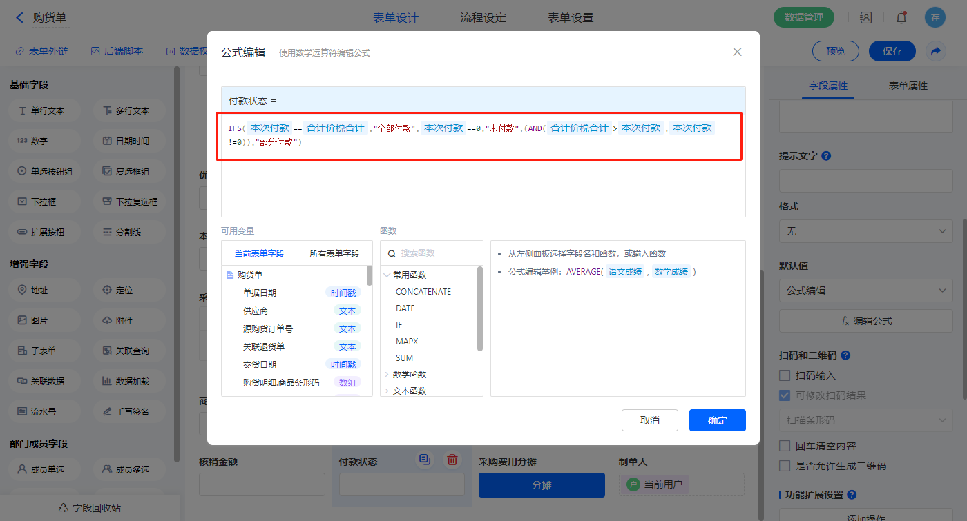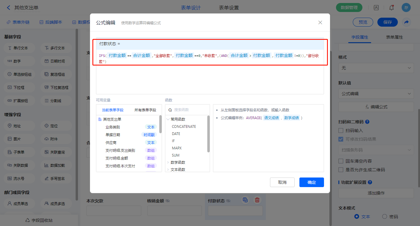 3)【支付明细.付款状态】字段设置默认值为公式编辑,设置公式:“IFS(支付明细.本次支付支付明细.金额,"全部付款",支付明细.本次支付0,"未付款",(AND(支付明细.金额>支付明细.本次支付,支付明细.本次支付!=0)),"部分付款")”;