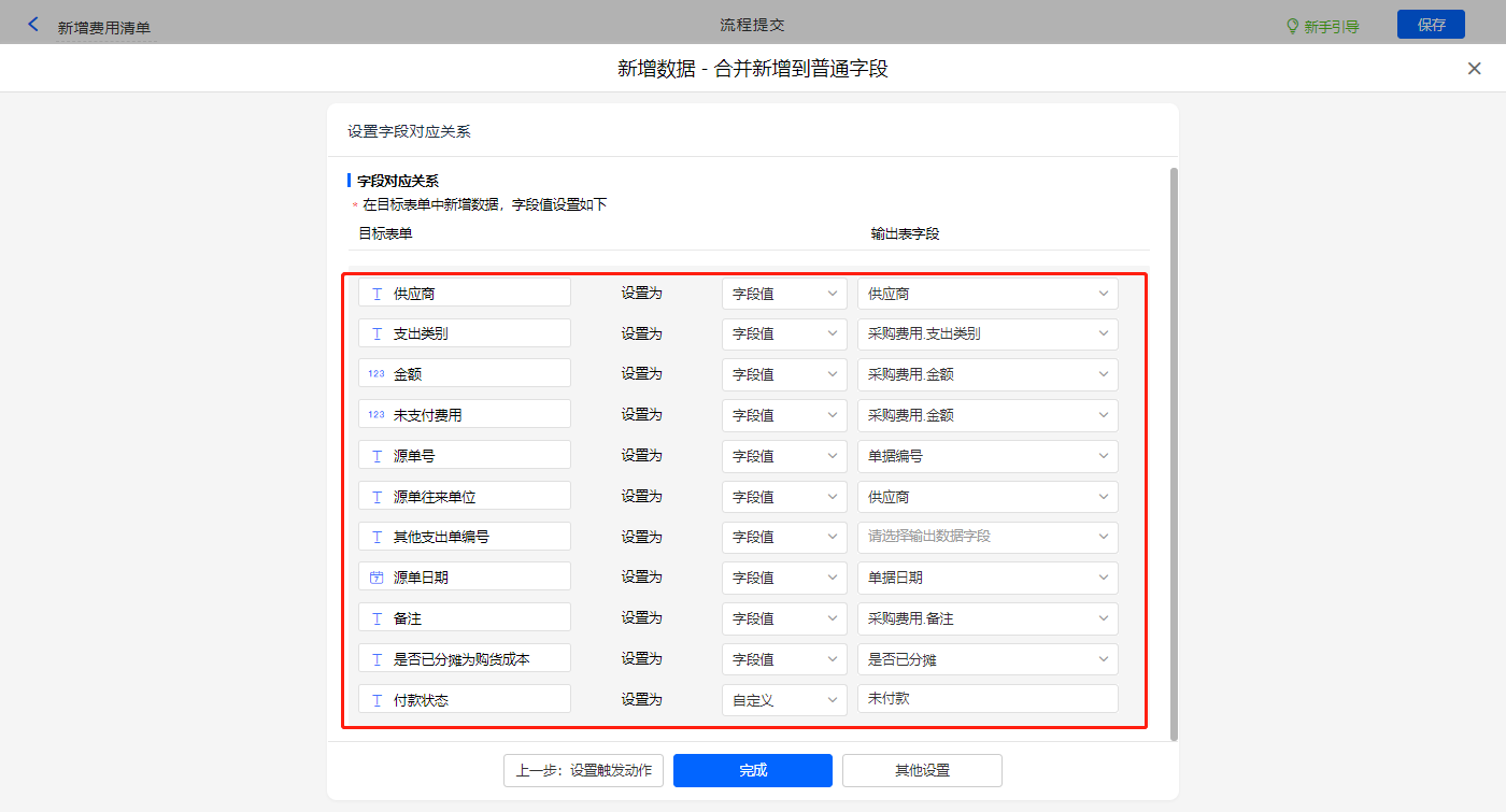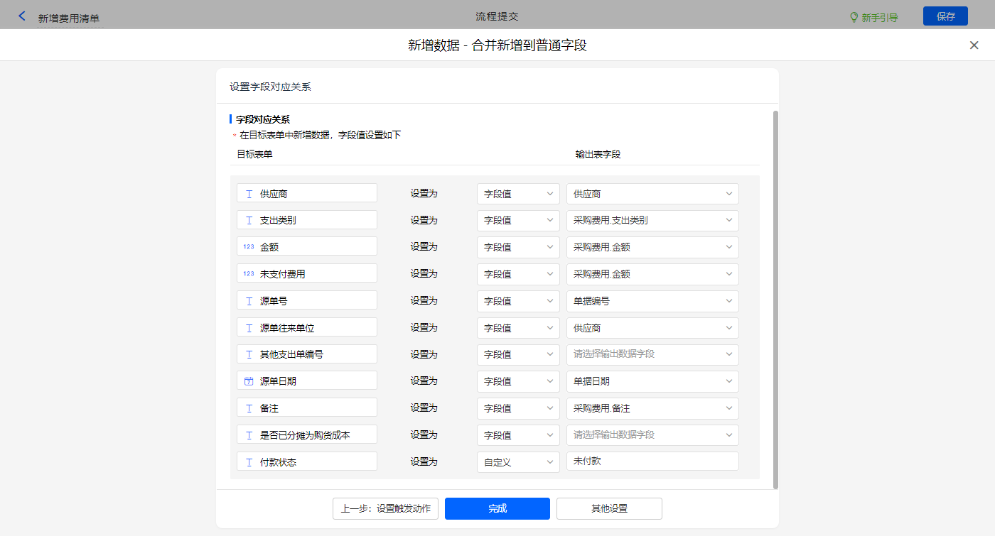 新增费用清单的数据助手,新增新增数据的执行动作,选择目标表单【费用清单】,选择对应字段,设置好点击【完成】并保存该数据助手;