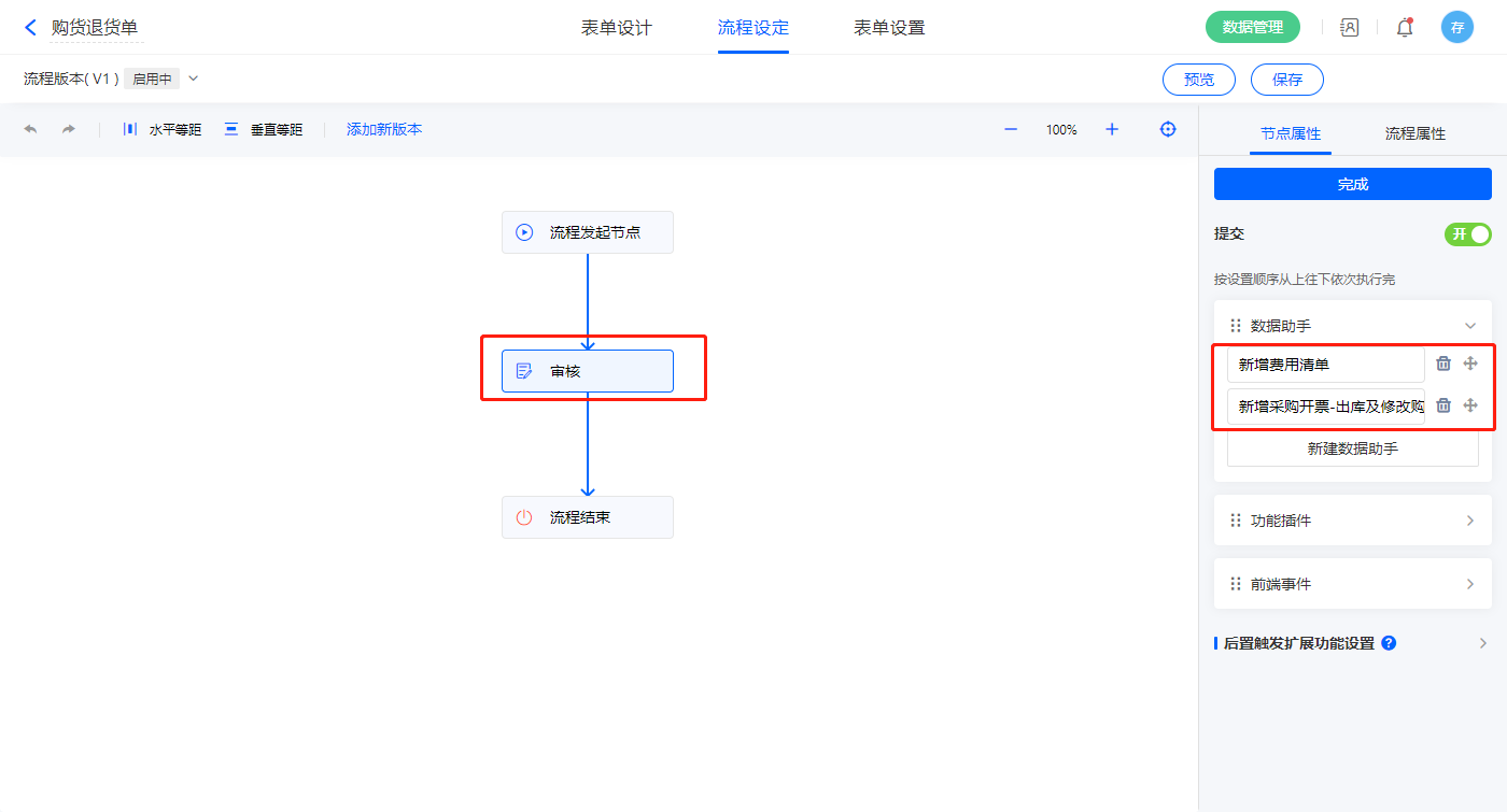 2)该表单是流程表单,设置流程节点审核,该节点属性的节点权限提交设置两条数据助手,分别名称为新增费用清单、新增采购开票-出库及修改购货单;