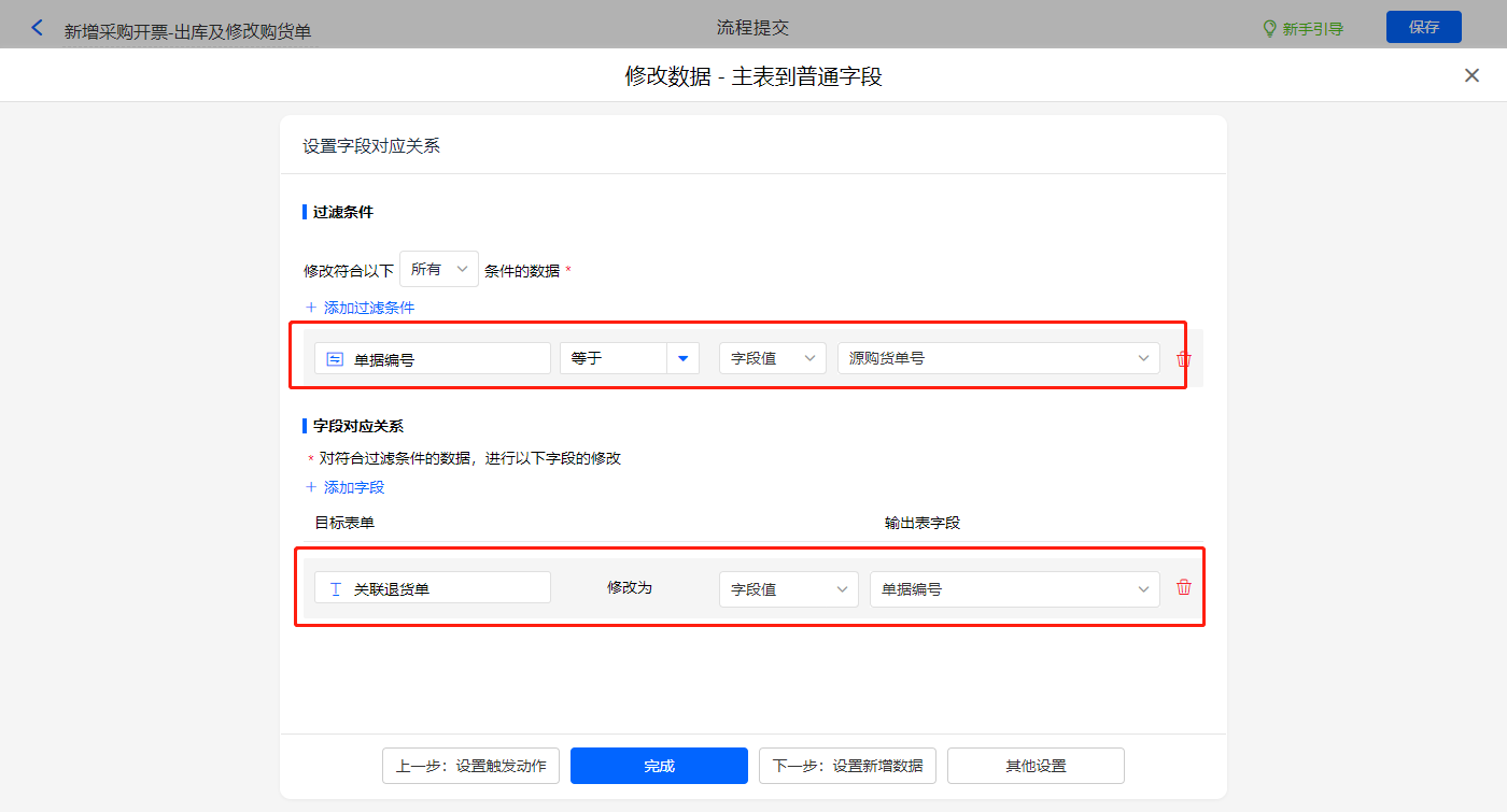 新增修改数据的执行动作,选择修改【购货单】表单,选择对应过滤条件,以及需要修改的字段,设置好点击【完成】并保存该数据助手;
