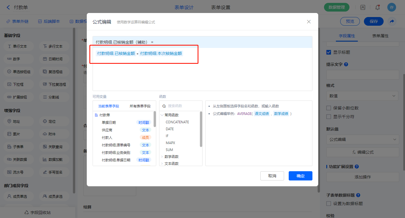 选择【付款明细.已核销金额(辅助)】字段,设置默认值为公式编辑,如图设置公式;