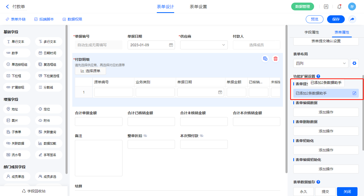 9)表单提交数据新增两条数据助手,名称分为新增付款辅助表数据、修改费用清单数据;