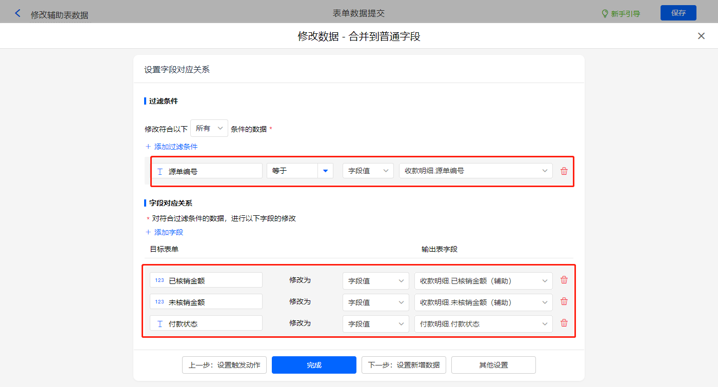 修改付款状态的数据助手,新增修改数据的执行动作,选择修改【付款单辅助表】表单,选择对应过滤条件,以及需要修改的字段,设置好点击【完成】并保存该数据助手;