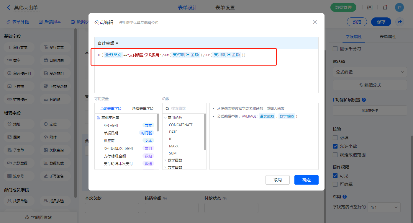 6)【合计金额】字段设置默认值为公式编辑,设置公式:“IF(业务类别=="支付销售/采购费用",SUM(支付明细.金额),SUM(支出明细.金额))”;