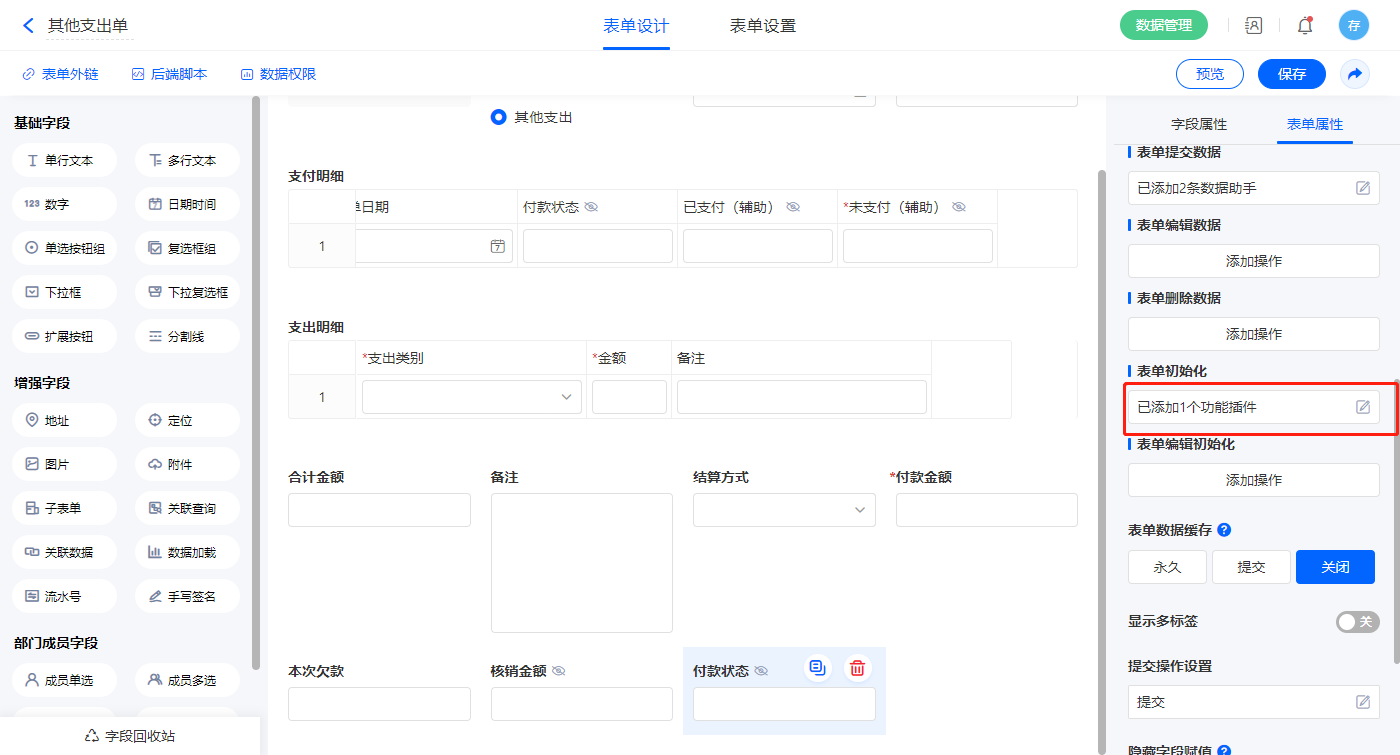 2)【支付明细.本次支付】字段添加功能扩展设置,添加功能插件【控件 - 触发指定公式】;