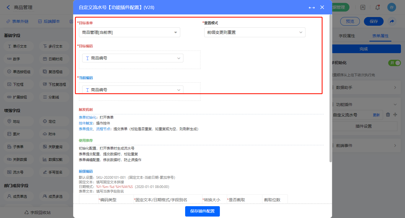 选择目标表为当前表,设置目标编码为【商品编号】字段、编码规则,设置完成点击【保存模块设置】;