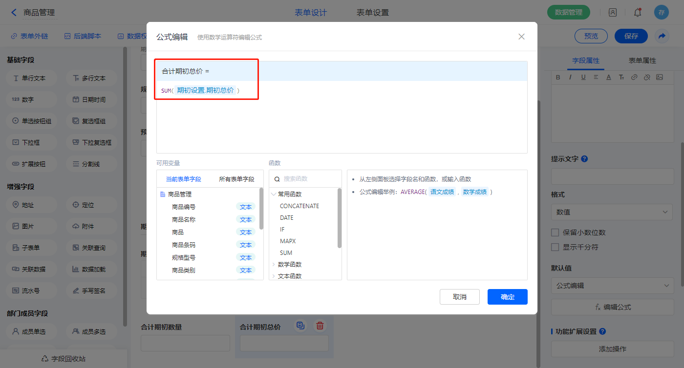 2)【合计期初数量】字段设置默认值为公式编辑,如图设置公式;