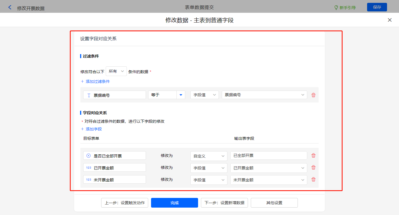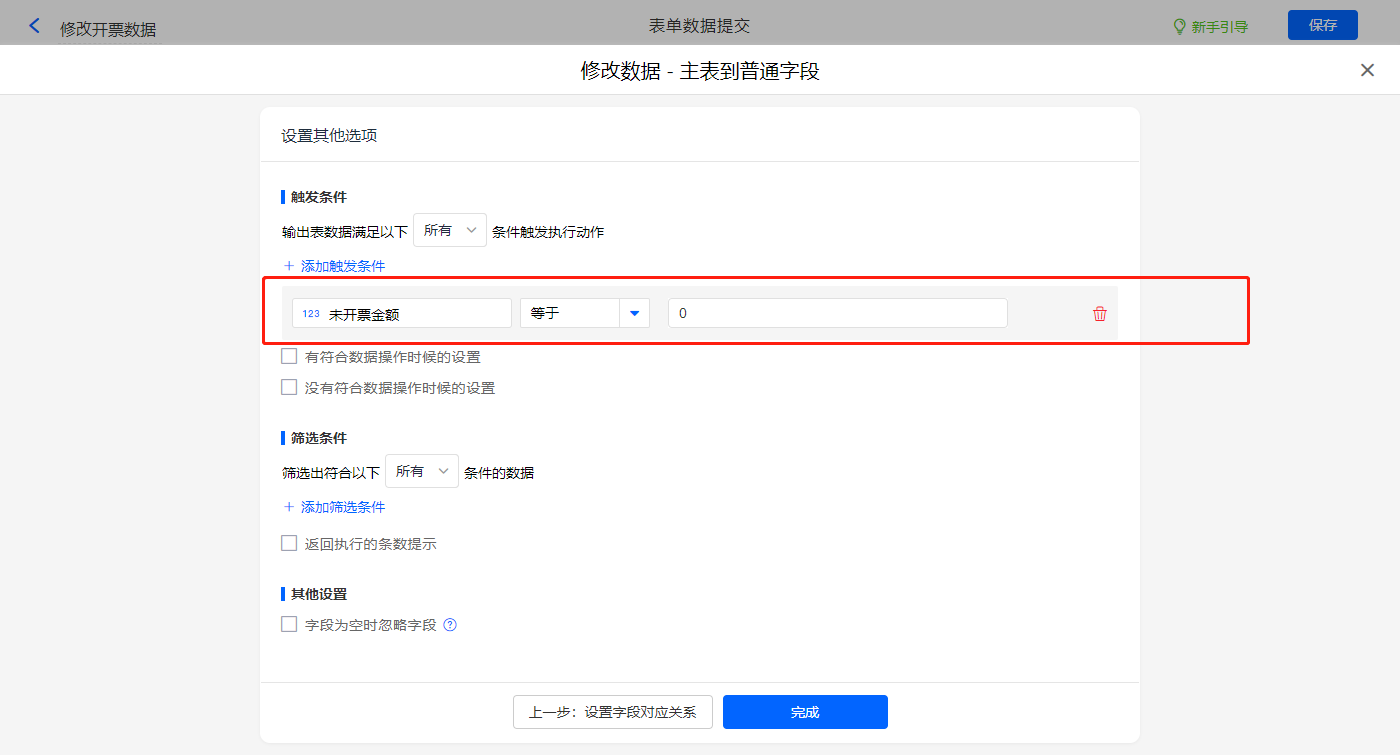 其他设置的触发条件为【未开票金额】等于0,设置好点击【完成】并保存该数据助手;