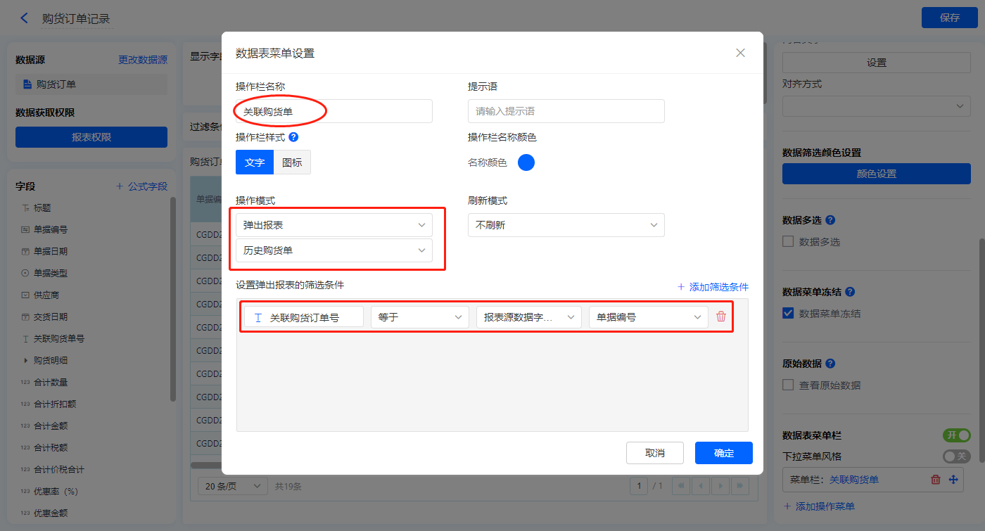 【关联购货单】的菜单栏,操作模式设置为弹出报表【历史购货单】;