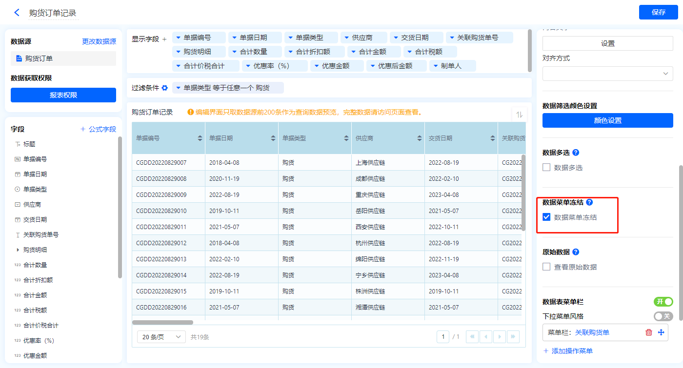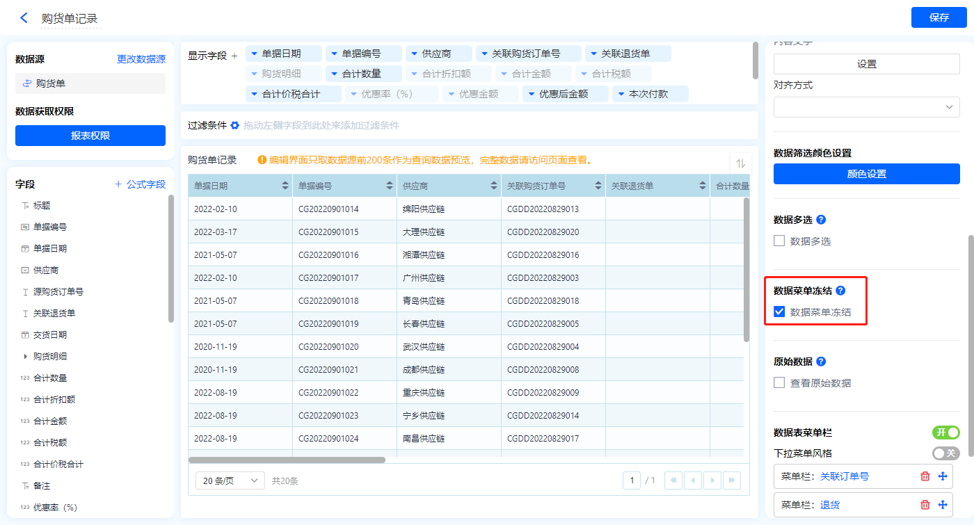 3)数据菜单冻结属性打钩,固定数据表菜单栏位置;