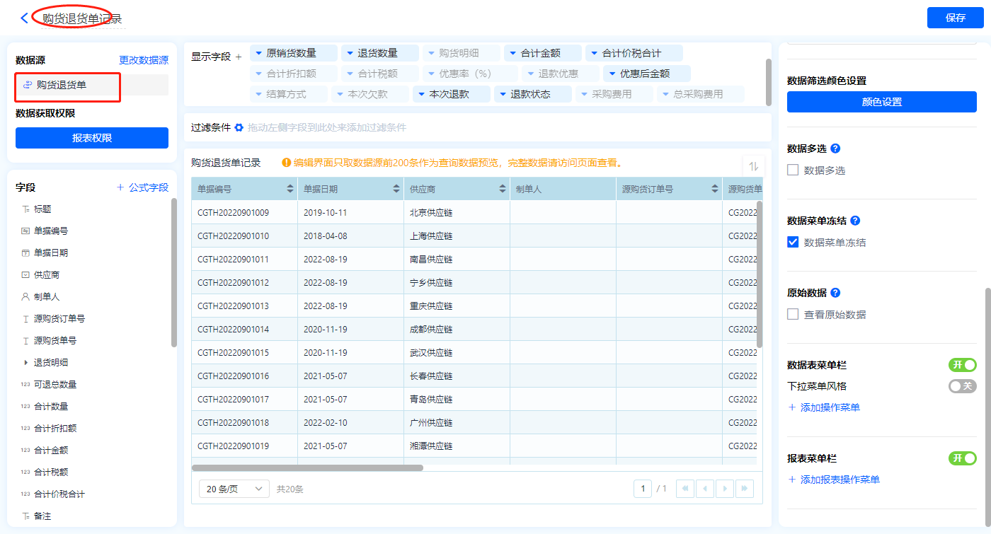 1)新增【历史购货退货订单】报表,用基础报表【数据表】展示数据源为表单【购货退货】的数据;
