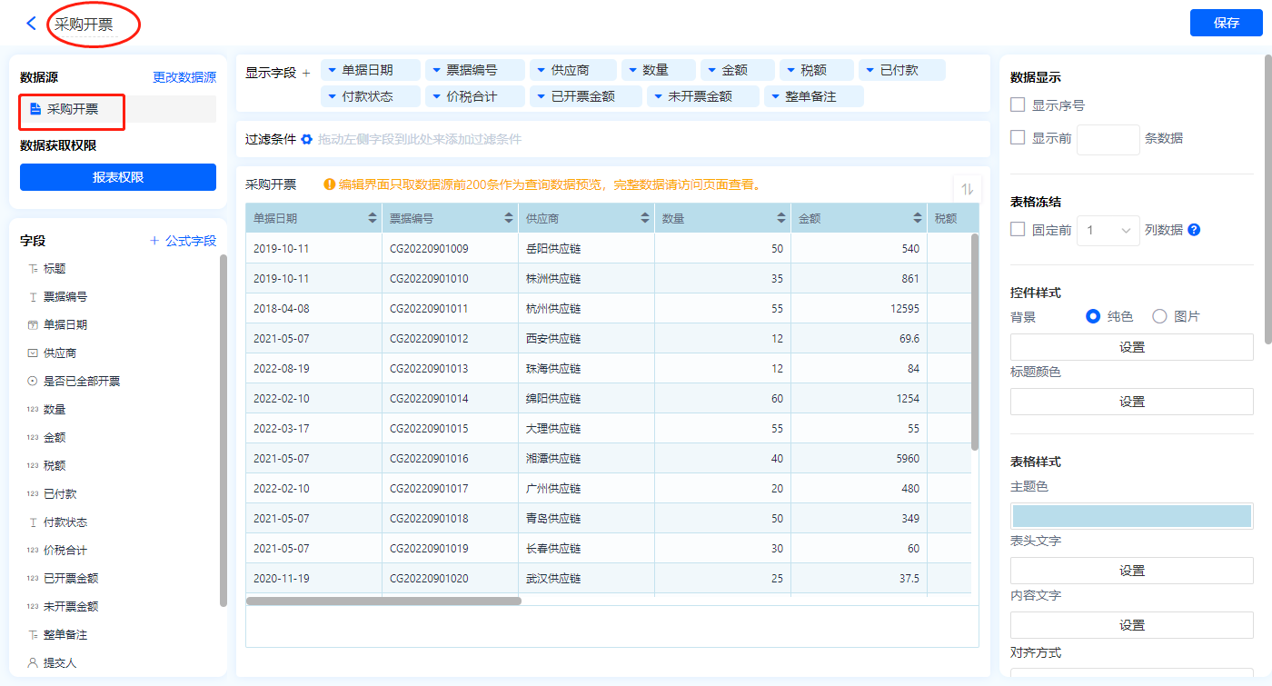 1)新增【采购开票】报表,用基础报表【数据表】展示数据源为表单【采购开票】的数据;
