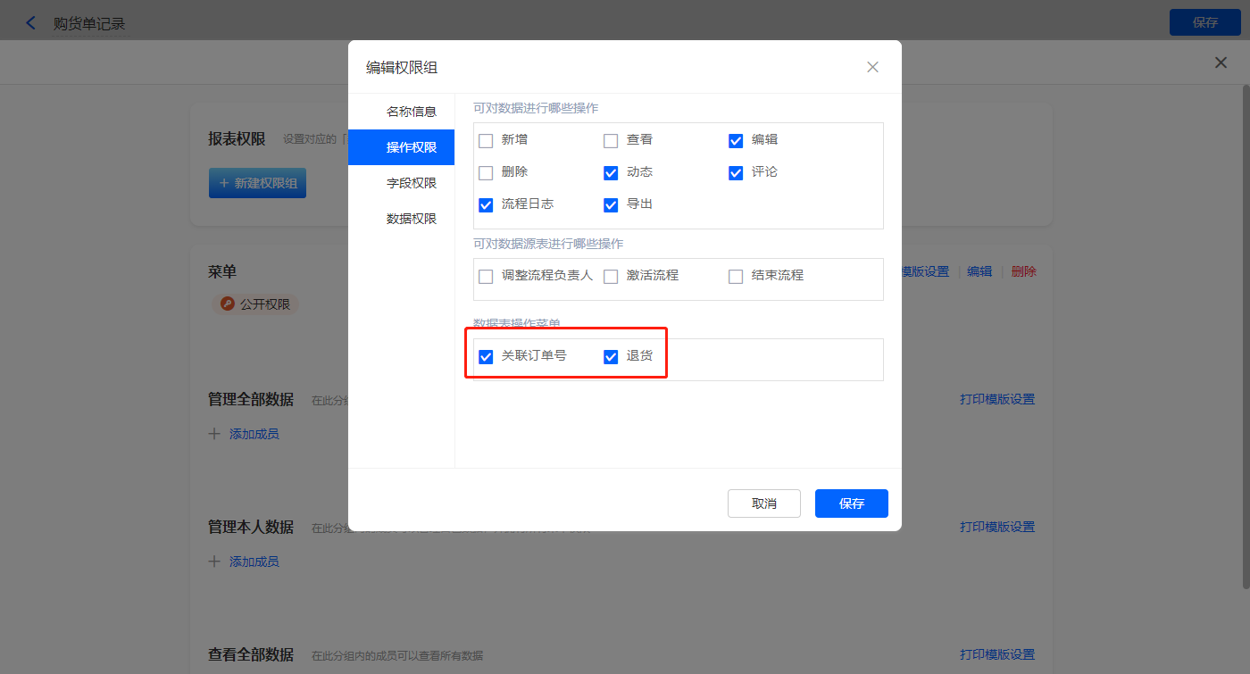 2)新增数据表菜单栏【关联订单号】、【退货】,配置如下;