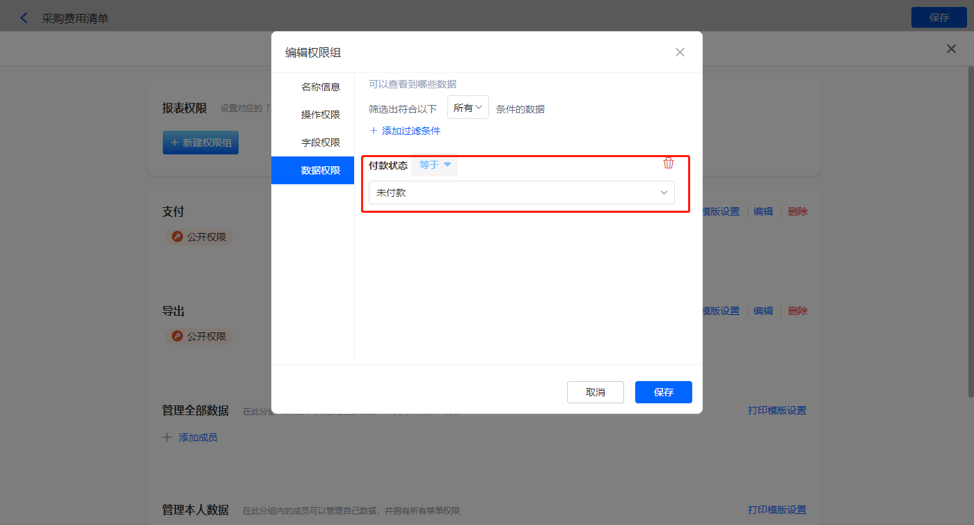 3)设置报表的权限,填入权限组名称,选择可操作的数据表菜单,点击【保存】;