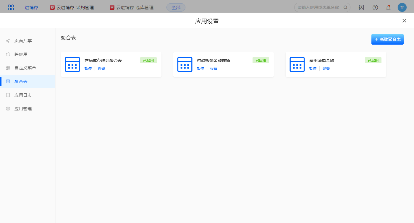 1)该应用运用到三个聚合表【产品库存统计聚合表】、【付款核销金额详情】、【费用清单金额】;
