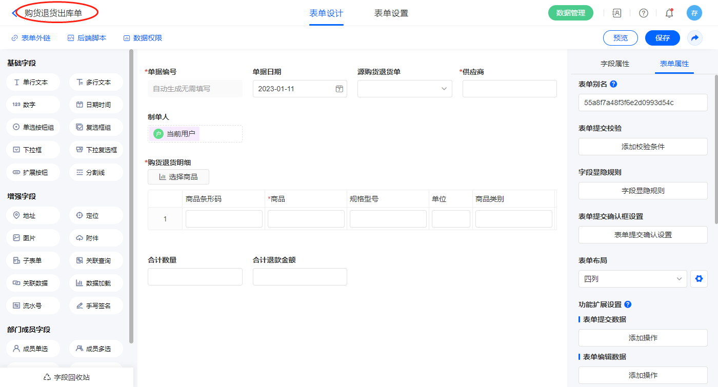 - 2.3、表单【购货退货单】字段及表单属性设置