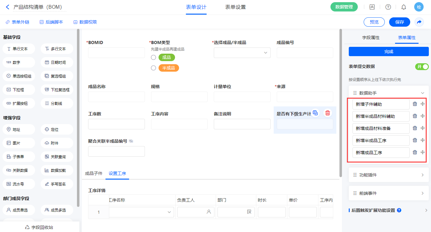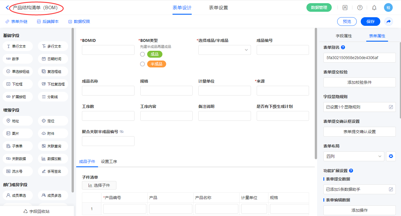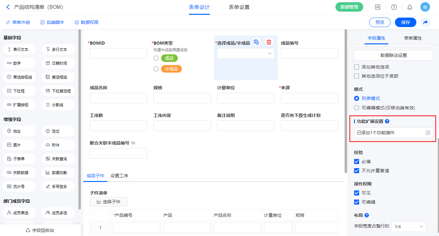 2.4、表单【产品结构清单(BOM)】字段及表单属性设置
