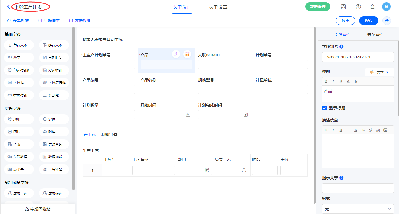 | 关联BOMID | 单行文本 | 生产工序 | 子表单 |