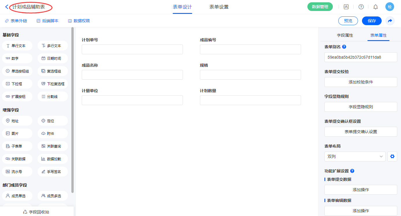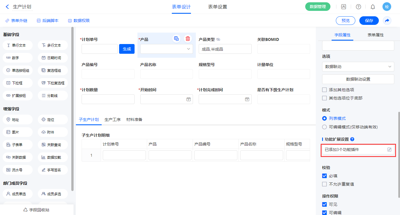 2.5、表单【生产计划】字段及表单属性设置