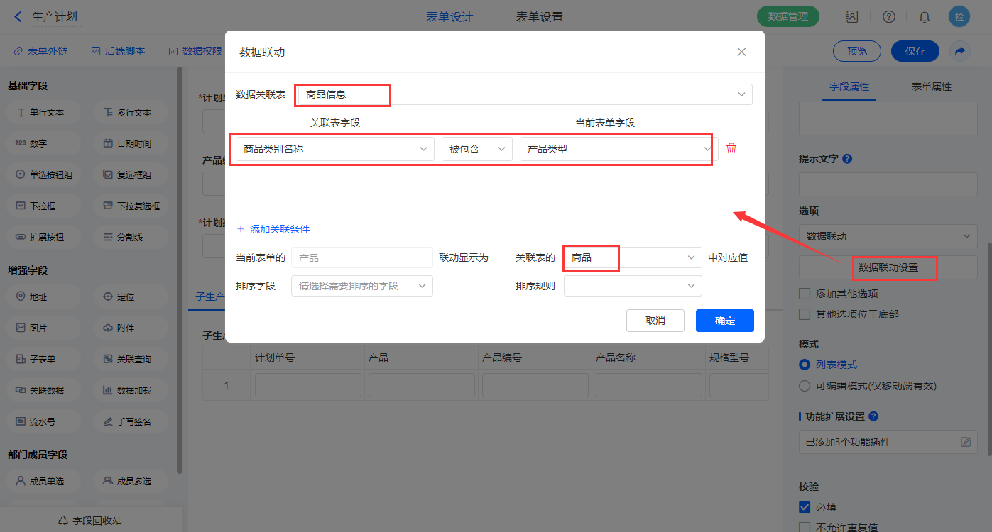【关联BOMID】、【是否有下级生产计划】字段设置默认值为数据联动,关联表及关联条件相同,设置对应的联动字段即可;