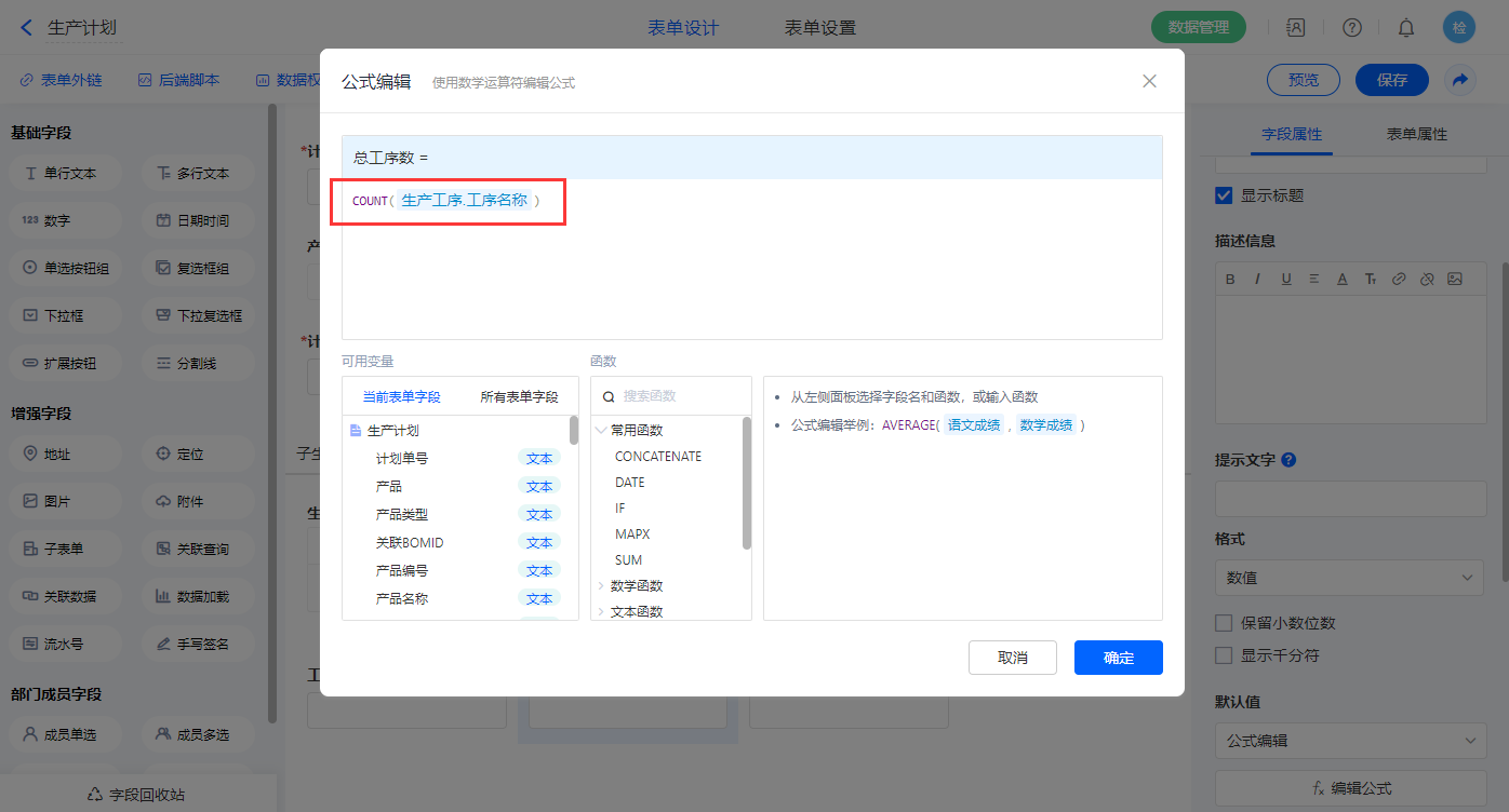 【总工序数】字段,设置默认值为公式编辑,如图设置公式;
