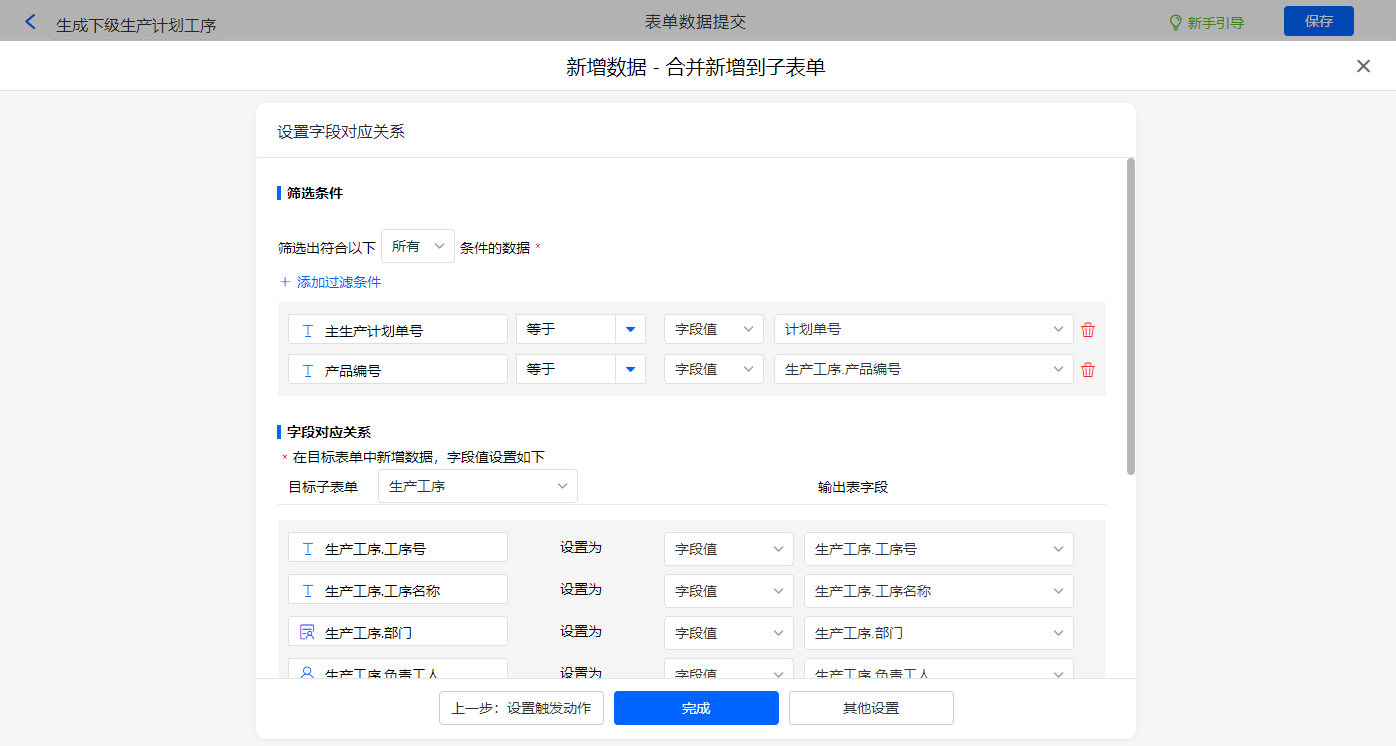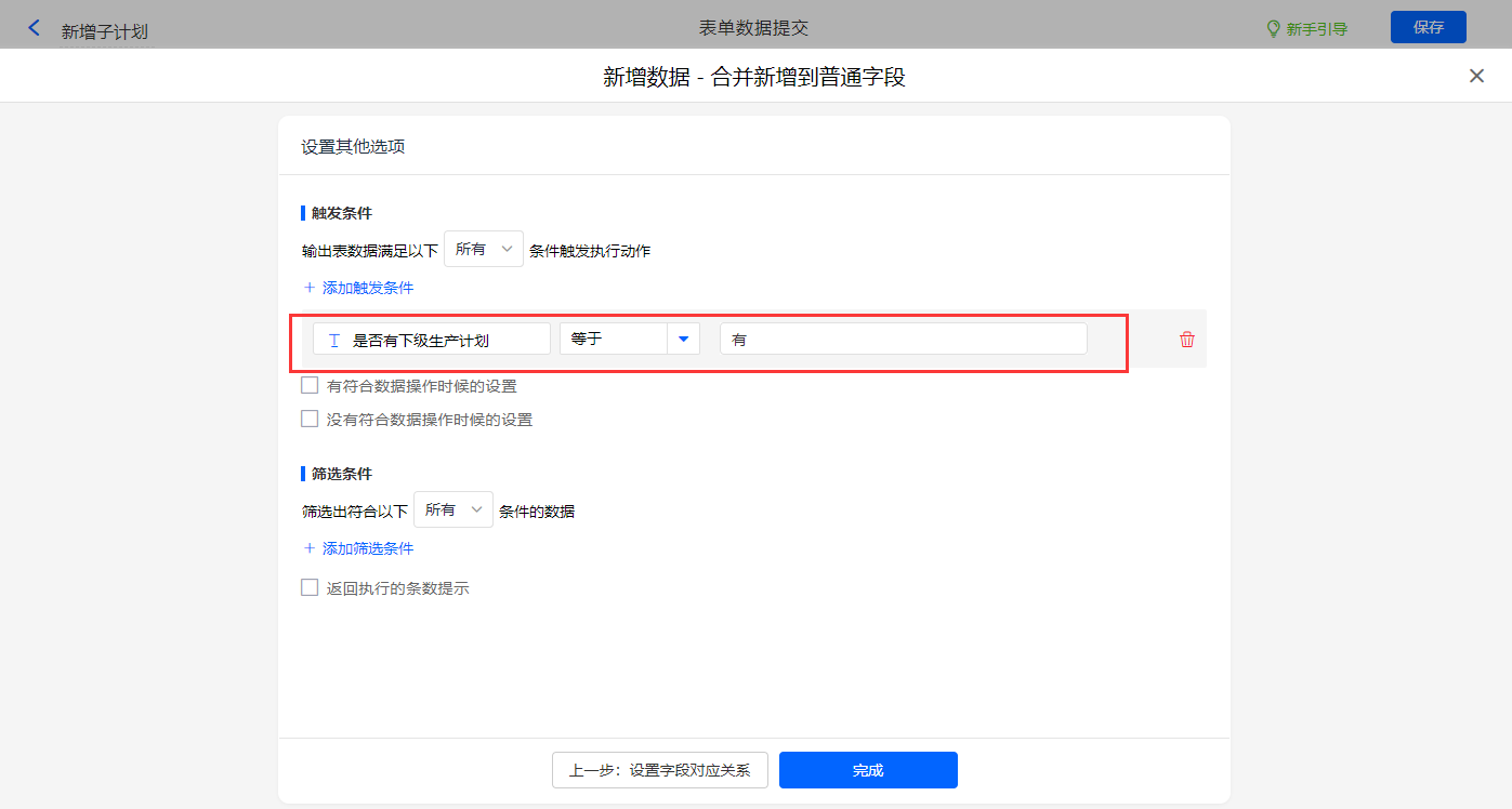 其他设置触发条件为【是否有下级子生产计划】字段等于有,设置好点击【完成】并保存该数据助手;
