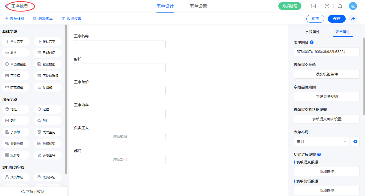 【总工序内容】字段,设置默认值为公式编辑,如图设置公式;