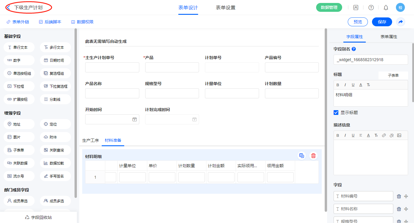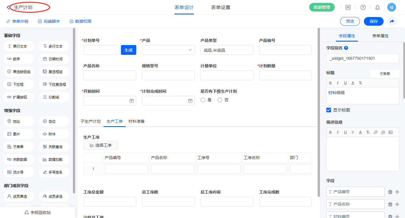 是否有下级生产计划 单选按钮组 生产工序 子表单