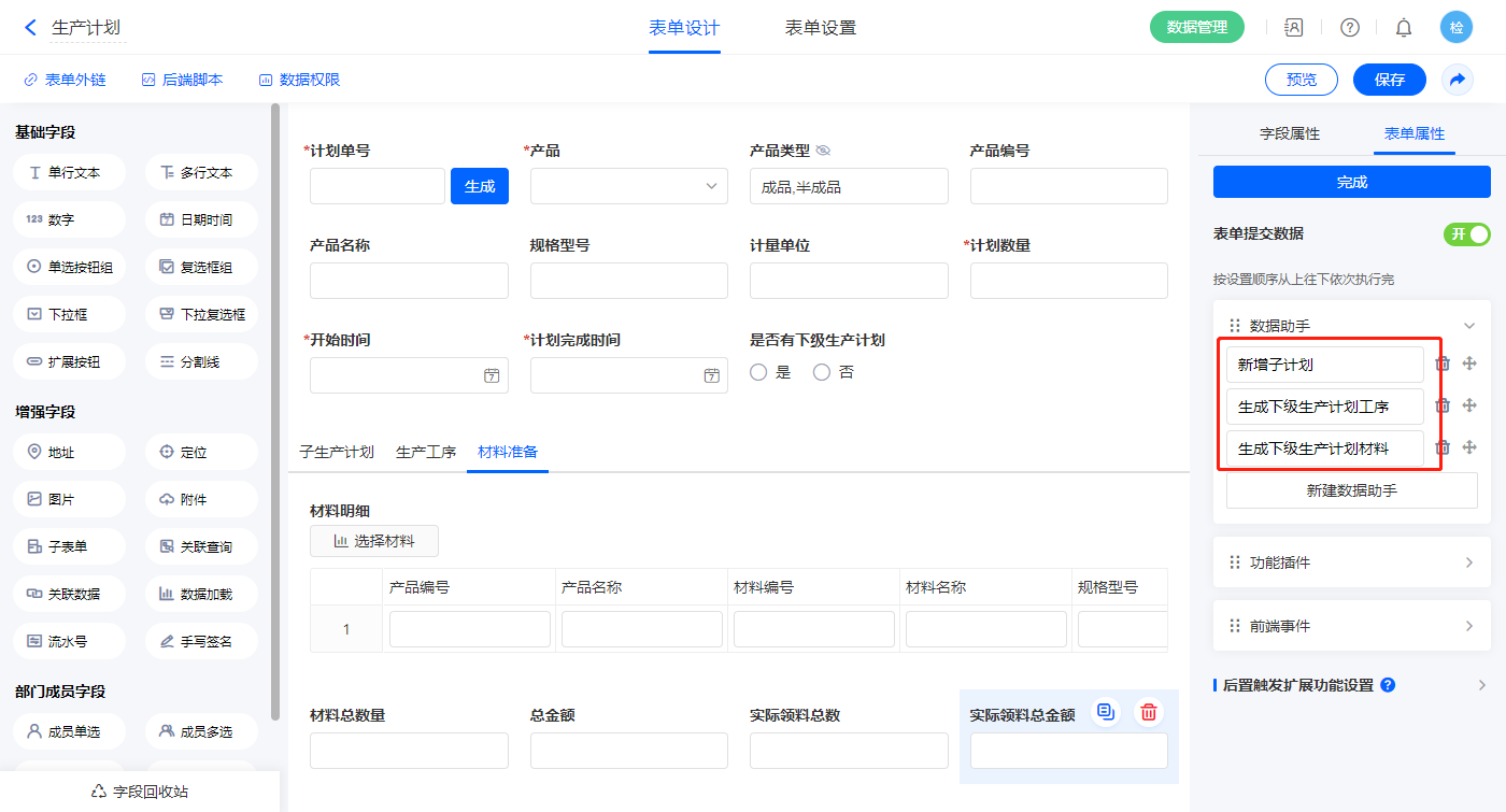 名称为生成下级生产计划材料的数据助手,新增新增数据执行动作,选择目标表单【下级生产计划】,设置对应赋值字段,设置好点击【完成】并保存该数据助手;