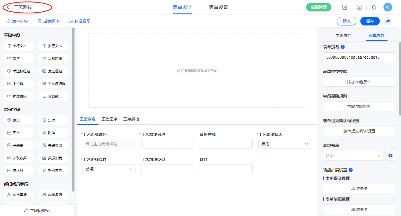 2.3、表单【工艺路线】字段及表单属性设置