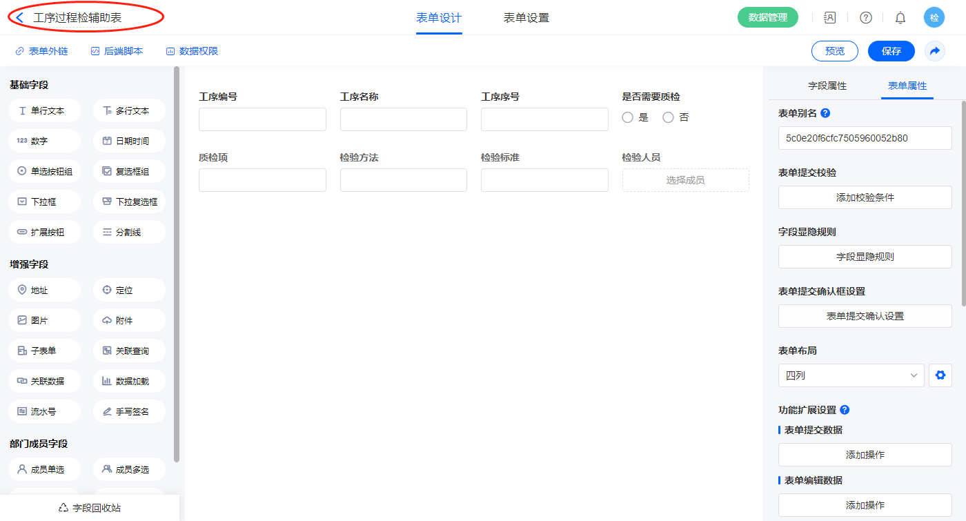 6)新增表单【工序过程检辅助表】,字段设置如下;