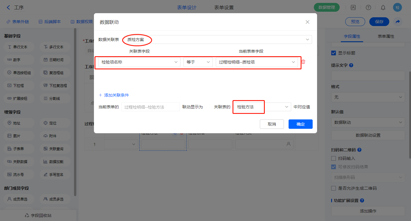 5)【过程检】字段,设置默认值为数据联动,设置联动条件及联动字段;