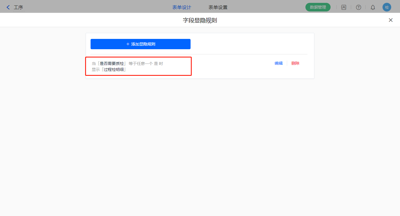 3)表单属性设置显隐规则,当【是否需要质检】字段等于是,显示【过程检明细】字段;