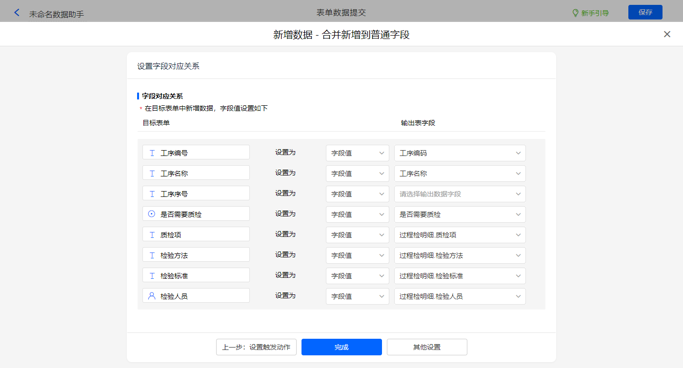 名称为新建工序质检辅助,新增新增数据执行动作,选择目标表单【工序过程检辅助表】,设置对应赋值字段,设置好点击【完成】并保存该数据助手;